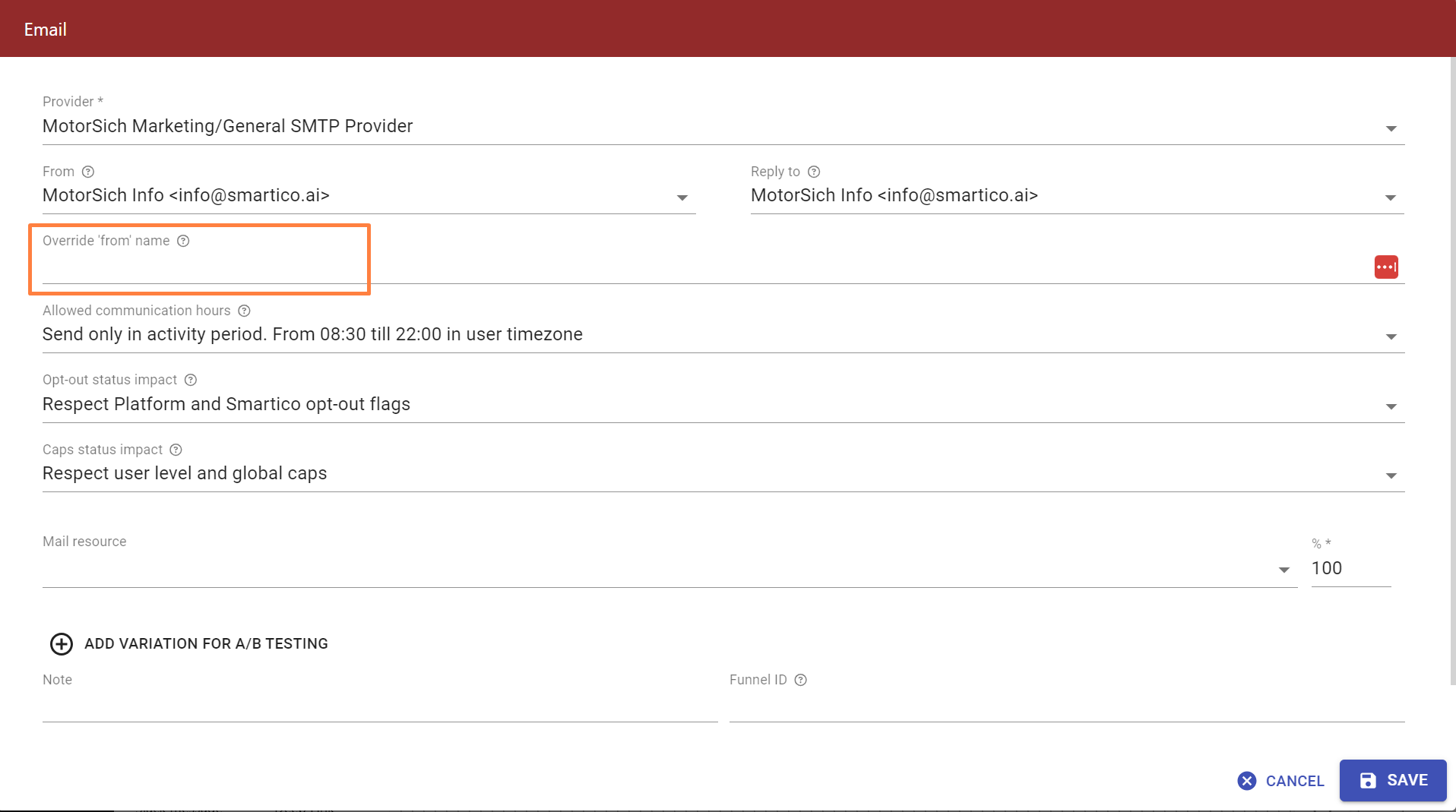 Now you can override the 'from' name that will be used when sending mail. We have added a new option called **‘Override 'from’ name'** in the email resource. For example, your current selection is 'John <<no-reply@company.com>>' you can now set a custom 'from' to be 'Elon', in the case mail will be sent from 'Elon <<no-reploy@company.com>>’. This option also works in case of automatic selection of the gateway for multi-brand context.