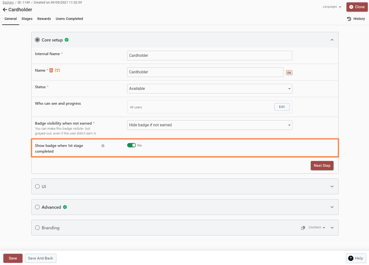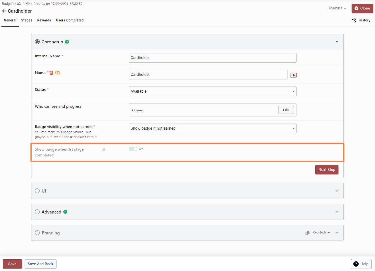 <figure><img src="https://77049817-files.gitbook.io/~/files/v0/b/gitbook-x-prod.appspot.com/o/spaces%2FfS5hl0PiysHtKAKMsQTe%2Fuploads%2Fgit-blob-535ca38fa82114924ade553f34b9b31528f5df4d%2FScreenshot_57.png?alt=media" alt=""><figcaption><p><strong>‘Show badge if not earned</strong>’ selected + <strong>‘Show badge if 1st stage completed’</strong> enabled (cannot be edited)</p></figcaption></figure>