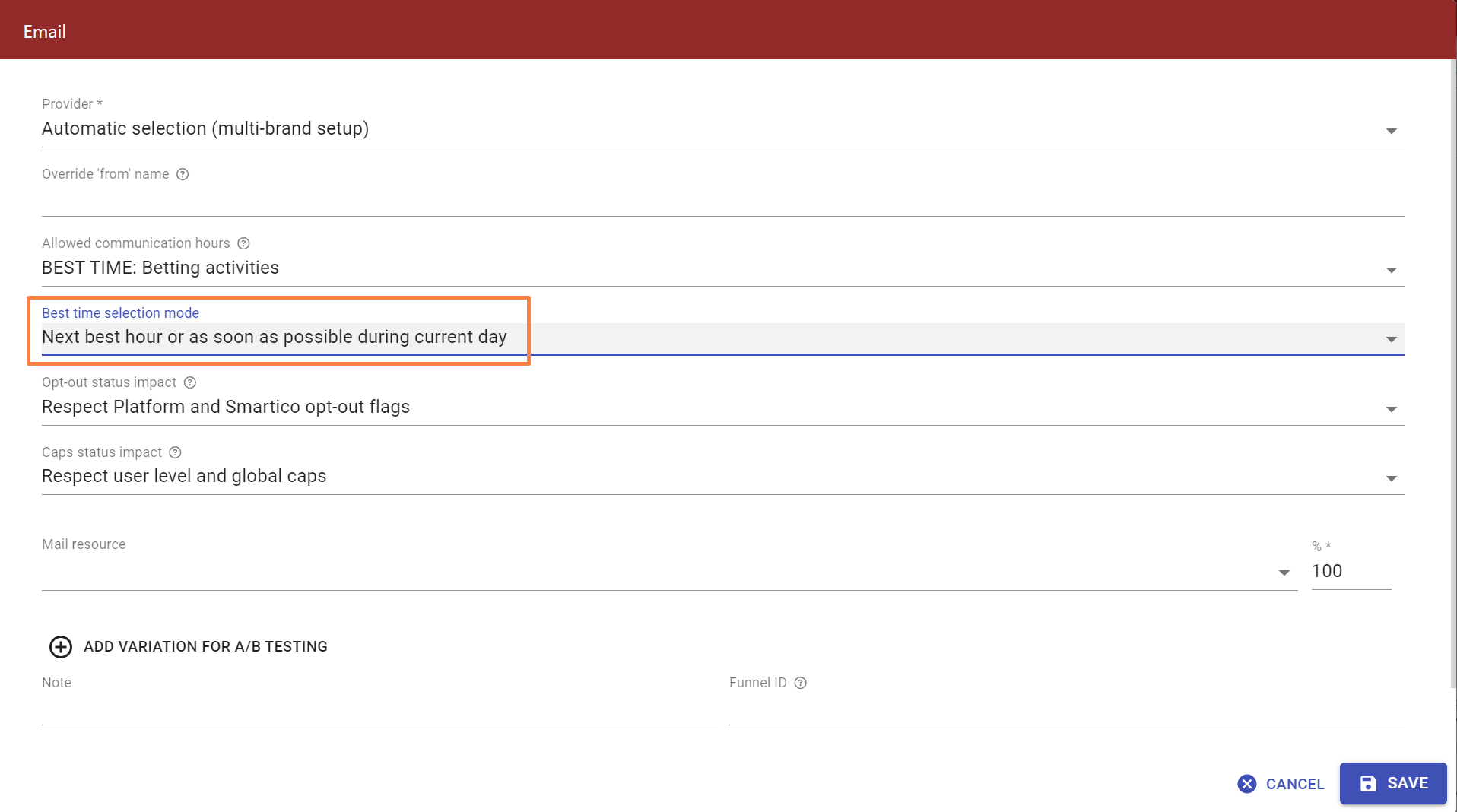 We have added a new option for the Best Time Selection Mode, called **‘Next best hour or as soon as possible during current day’** which could be selected on the resource level. With this new option, if the Best Communication Time for players is not today or has already passed, the resource will be executed immediately as the element becomes active.