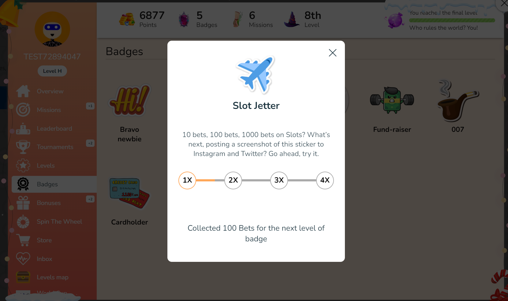 * **‘Hide badge if not earned’** selected + **‘Show badge if 1st stage completed’** enabled = the badge is not visible to the end user in the gamification widget, but when the 1st stage is completed, it appears in the widget. The players can check the progress and the tasks to complete the next stage.