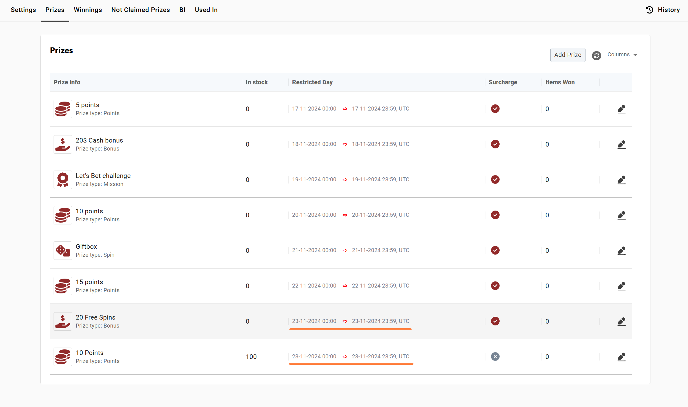 For Calendar Days, ensure the date range for the prize is exactly one day (e.g., Start Date: 10.10.2024, End Date: 10.10.2024).