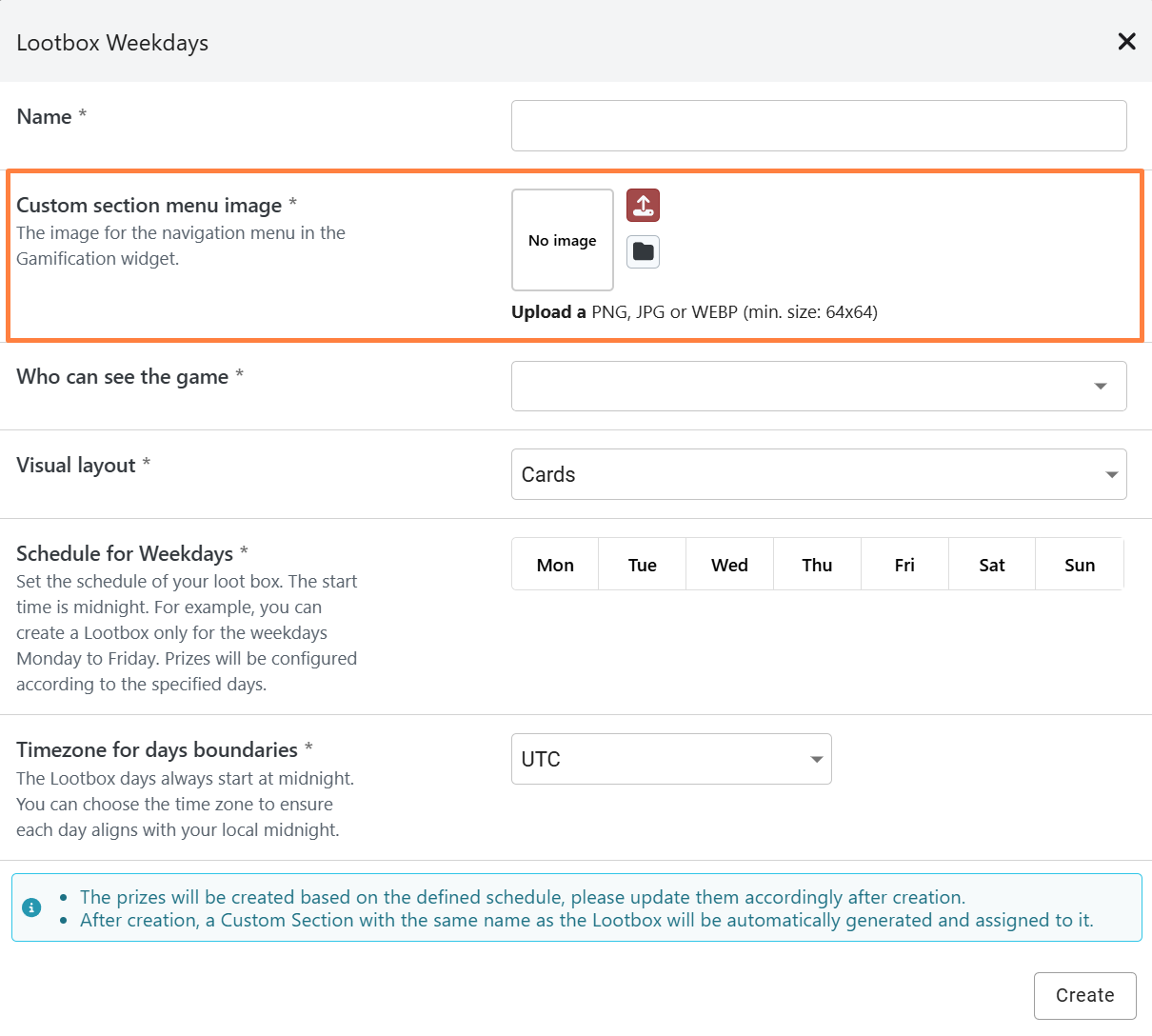 We’ve streamlined the Lootbox creation process by introducing automatic generation of a Custom Section. During the Lootbox setup wizard, you can now set the menu image that will be displayed in the Gamification Widget. Once you click ‘Create,’ a Custom Section with the same name as the Lootbox will be automatically generated and linked to it, saving you time and effort.