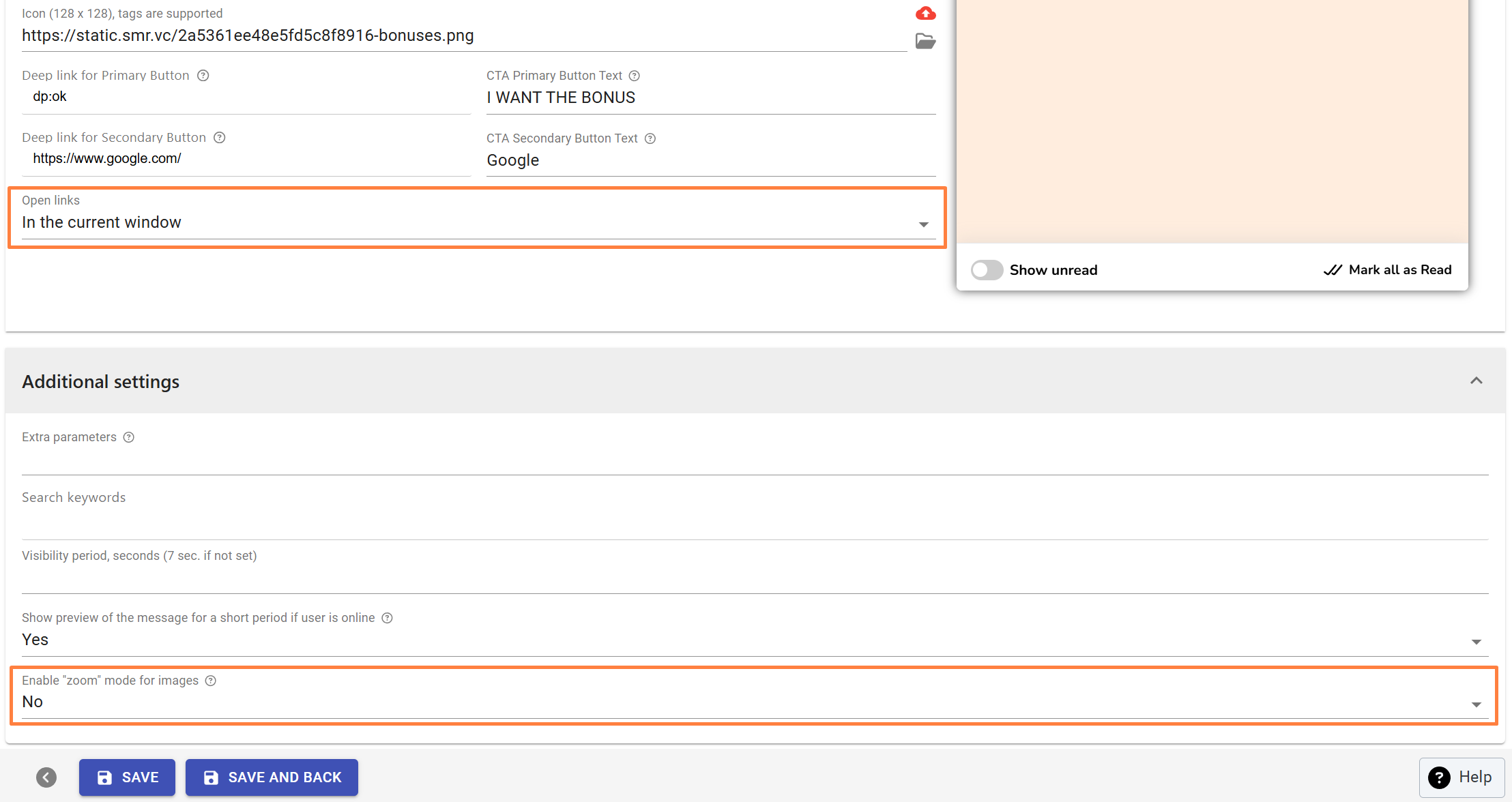 We’ve introduced two new enhancements for rich body inbox messages - **'Open Links'** and **'Enable zoom mode for images'**: