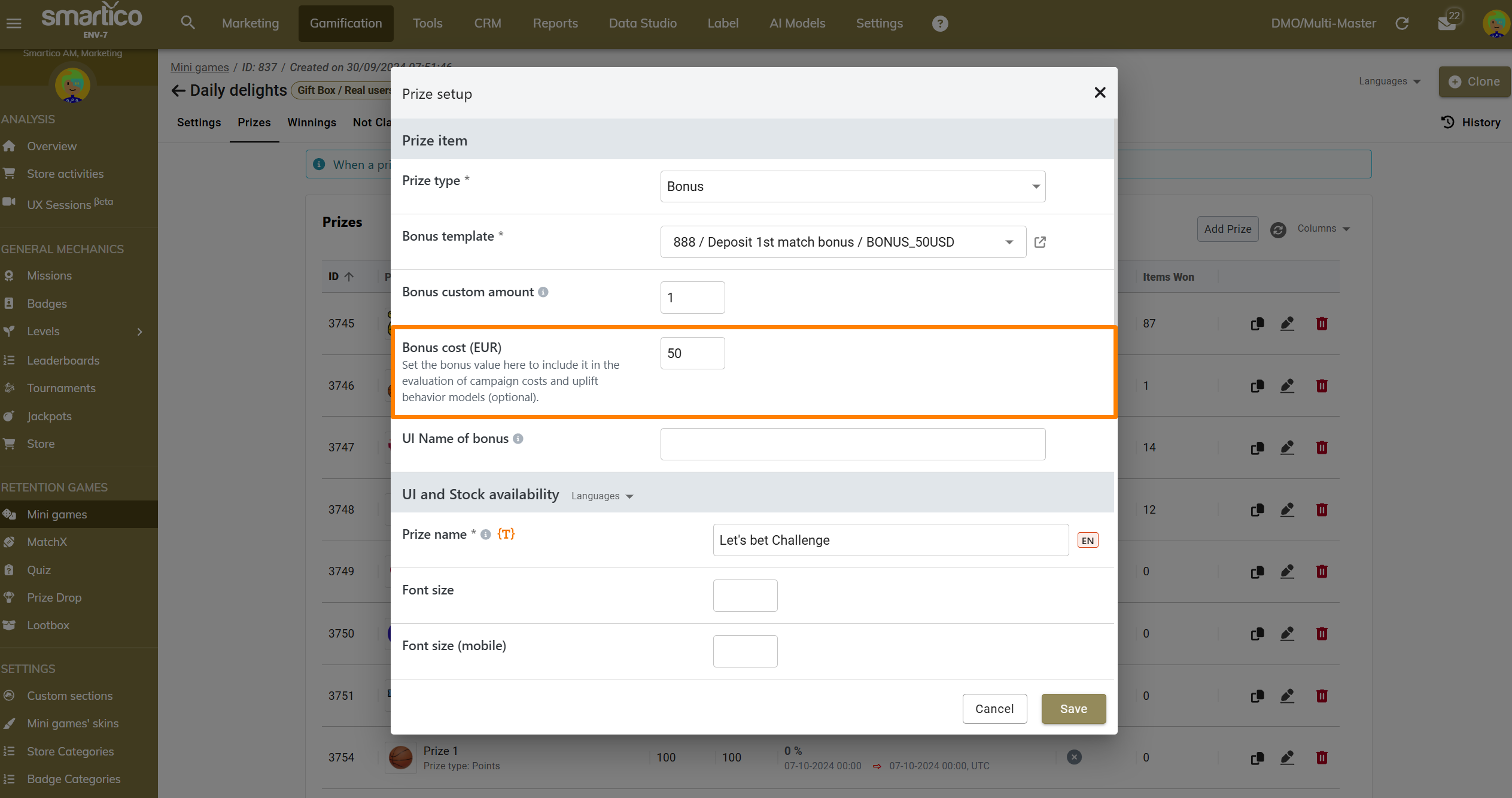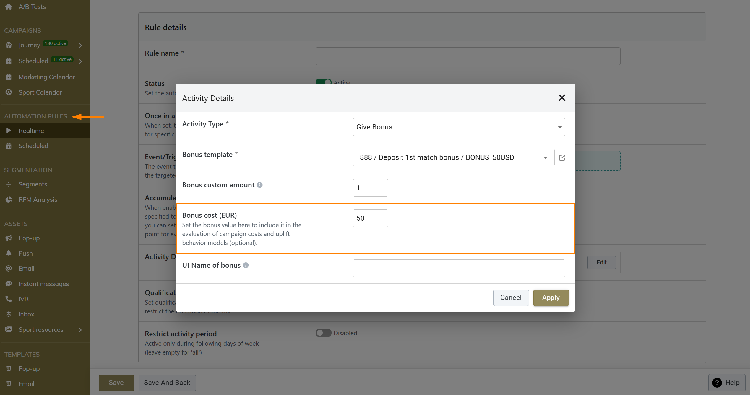 You can specify the bonus value when issuing a bonus through a campaign, automation rule, mission, mini-game, tournament, or store item. Once added, the bonus cost can be factored into campaign cost evaluations or used in uplift behavior models.