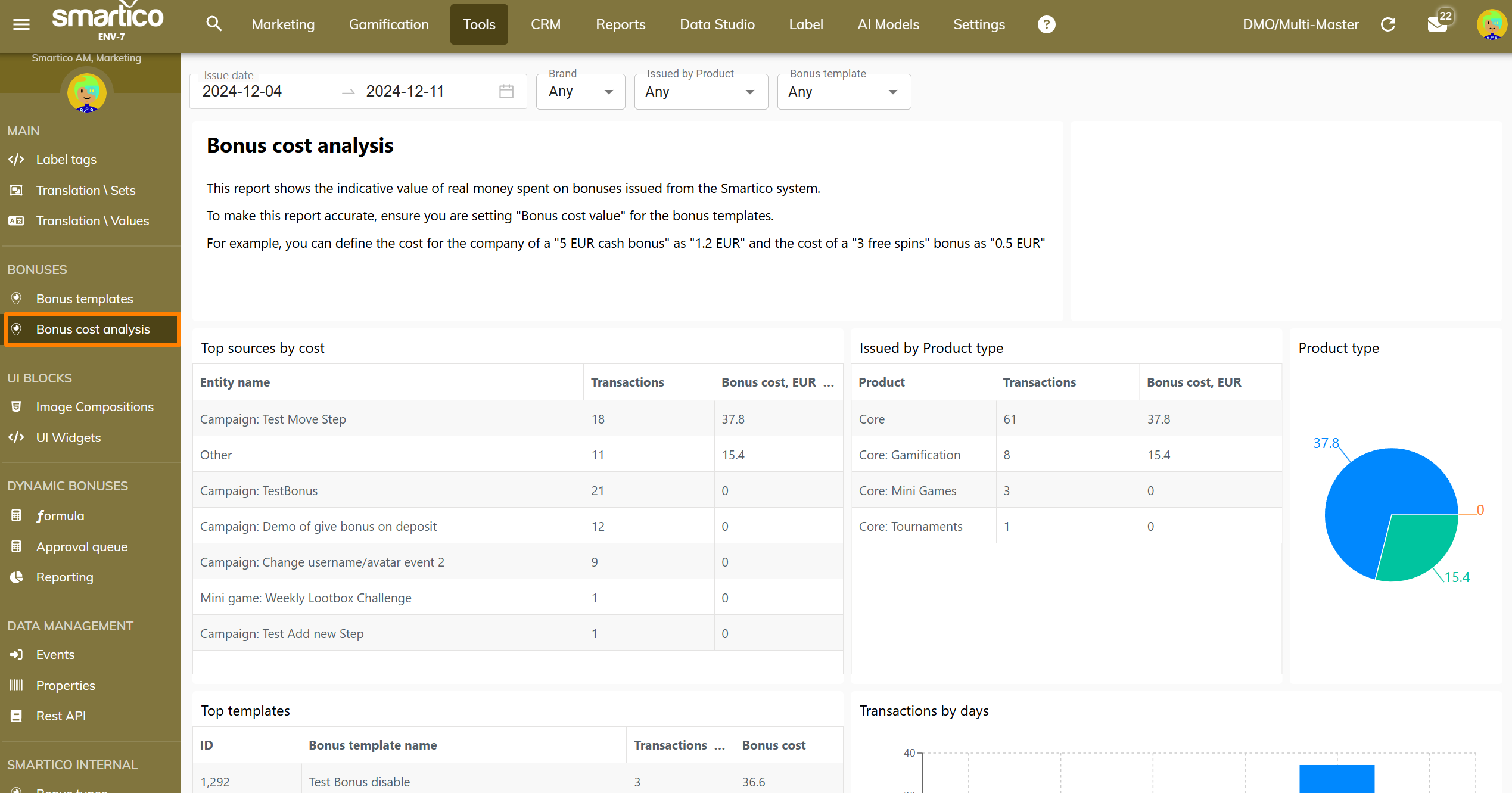 Use the **‘Bonus cost analysis’** report in the BO to review the estimated real-money value of bonuses distributed via the Smartico system.