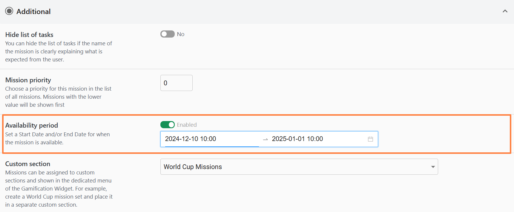* Set availability period: You can define a start and end date for when the mission will be active.