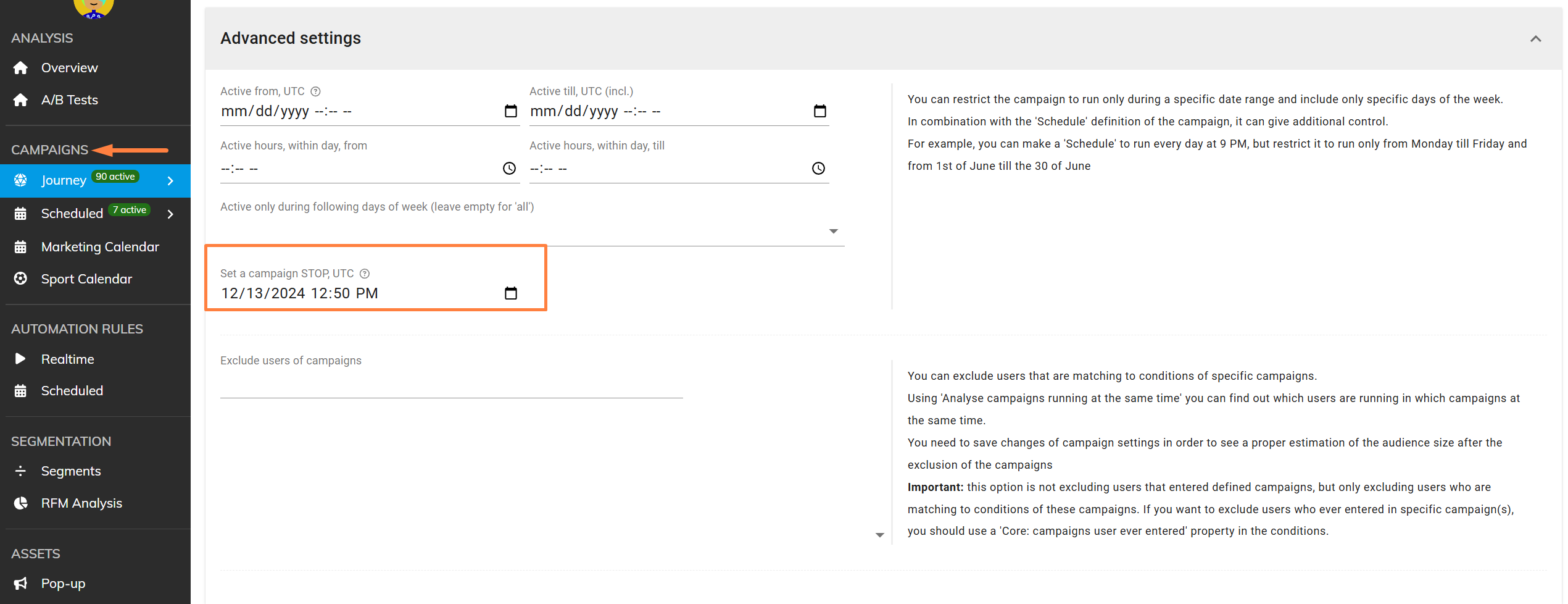 The **‘Set a campaign STOP’** option allows you to set a specific date and time to stop a campaign. You can find this option under ‘Advanced Settings’ in the campaign template. It's available for both real-time and scheduled campaigns.
