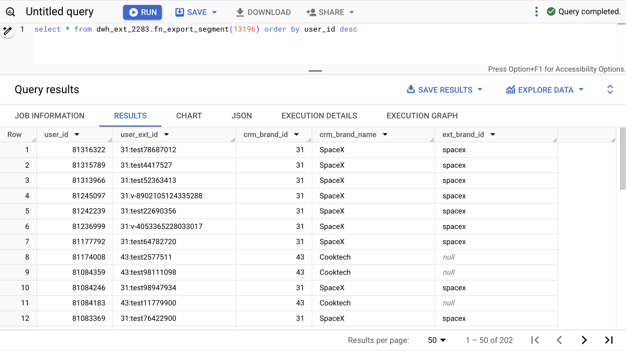 <figure><img src="https://77049817-files.gitbook.io/~/files/v0/b/gitbook-x-prod.appspot.com/o/spaces%2FfS5hl0PiysHtKAKMsQTe%2Fuploads%2Fgit-blob-06201accd07c58b0501068cd96ead492bc34d18b%2FBigQuery%20%E2%80%93%20smartico-env2%20%E2%80%93%20Google%20Cloud%20console%202024-06-20%2023-13-01.png?alt=media" alt=""><figcaption><p>Exporting segments from DWH</p></figcaption></figure>