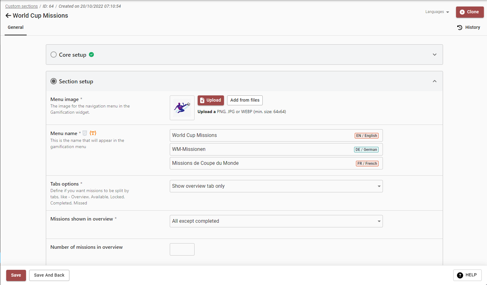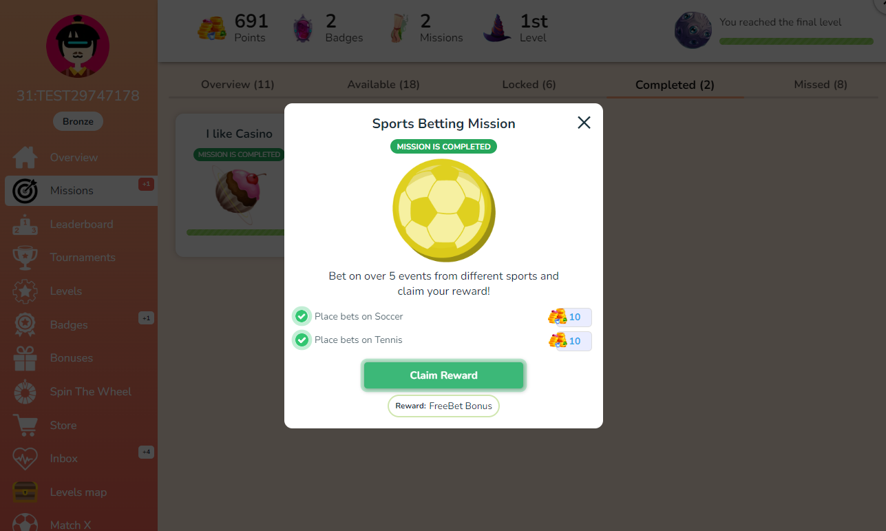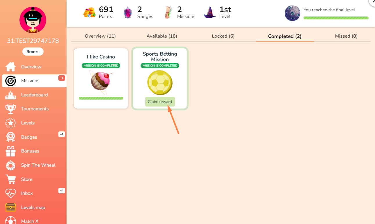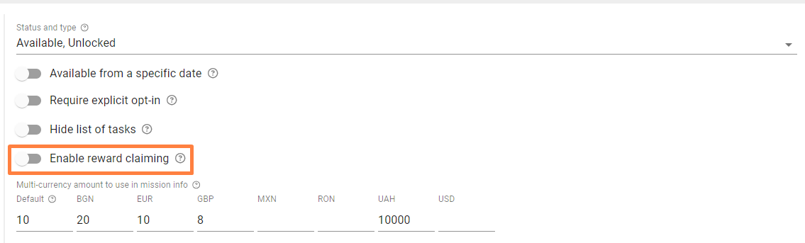 Keep in mind that if ‘**Enable reward claiming’** is ON, the points from the mission tasks will also be given to the user only after the reward is manually claimed from the player until then no points will be awarded.
