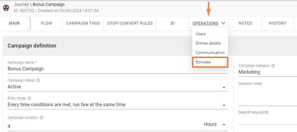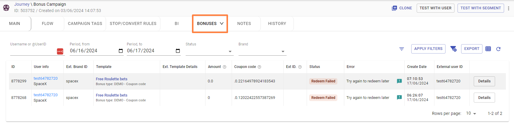 We’ve introduced Bonus History inside Real-time and Scheduled Campaigns. You can now easily track all bonuses issued through the selected campaign and view their status. This feature is available under the 'Operations' drop-down menu.