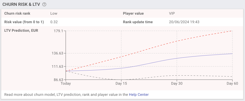 As soon as the model is activated, the operator can see the current and projected for 15, 30, and 60 days LTV of the user.