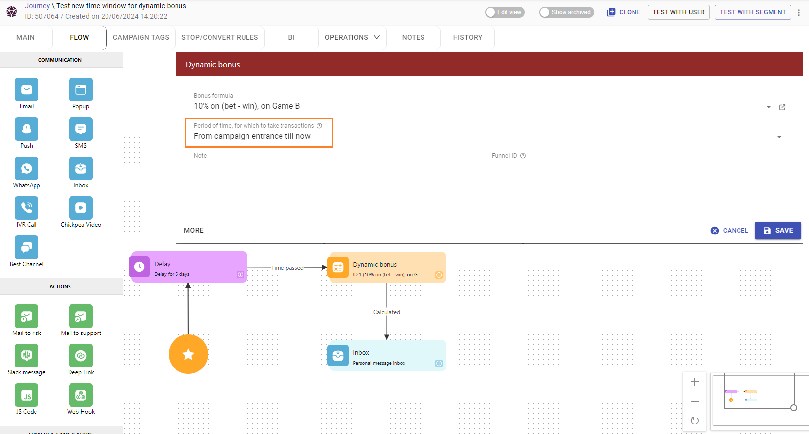 We've introduced a new time window for Dynamic Bonuses calculation in Campaigns called ‘From campaign entrance till now’. This option calculates and includes only the transactions made by a player from the time they entered the campaign up to the current moment. You can specify this current moment by setting a ‘Delay’ or ‘Delay till’ activity, defining the period in days, hours, minutes, or a specific date.