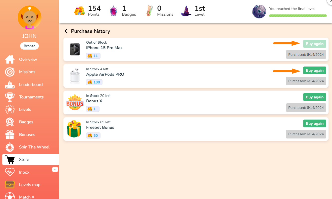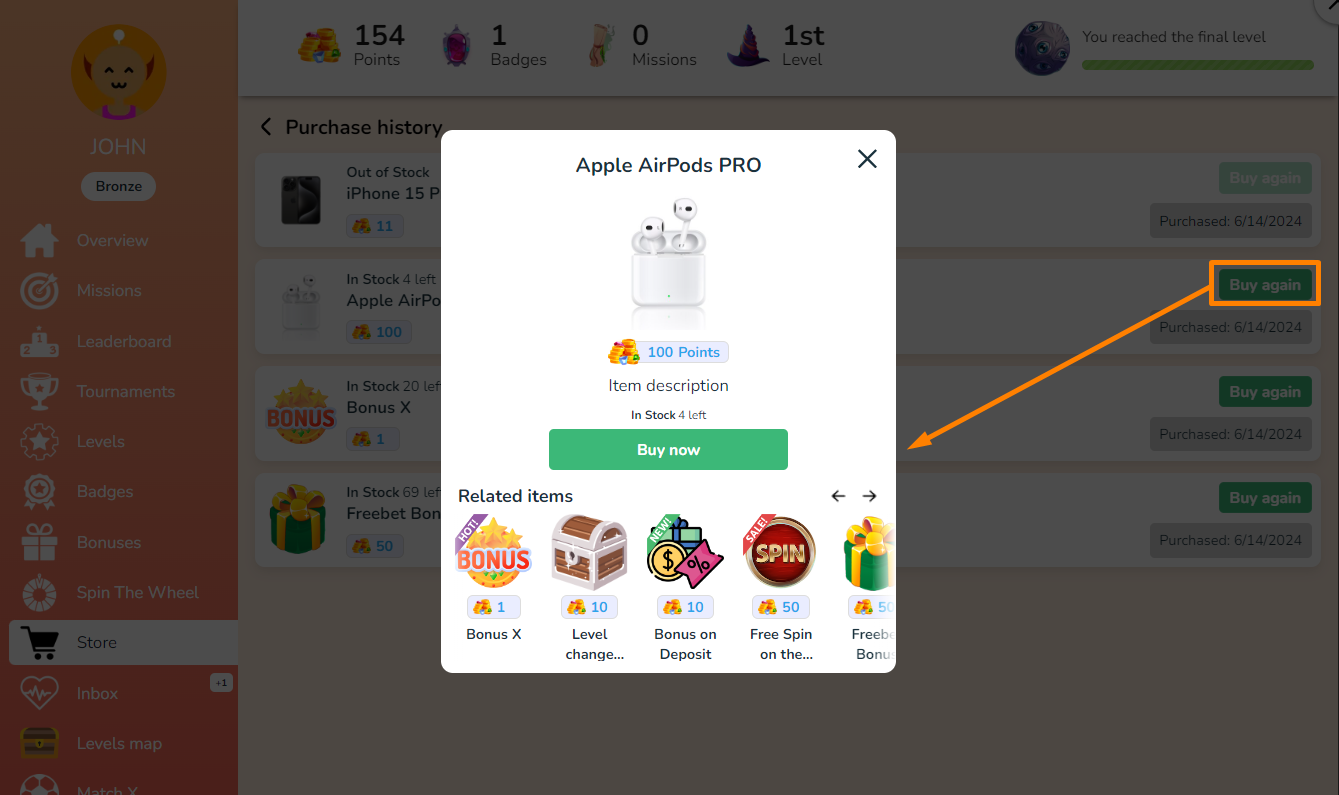 We've added a Purchase History feature to the gamification store. Players can now view all items they've purchased, including details such as cost, availability for repurchase, stock status (if managed by the operator), purchase date, and a "Buy Again" button.