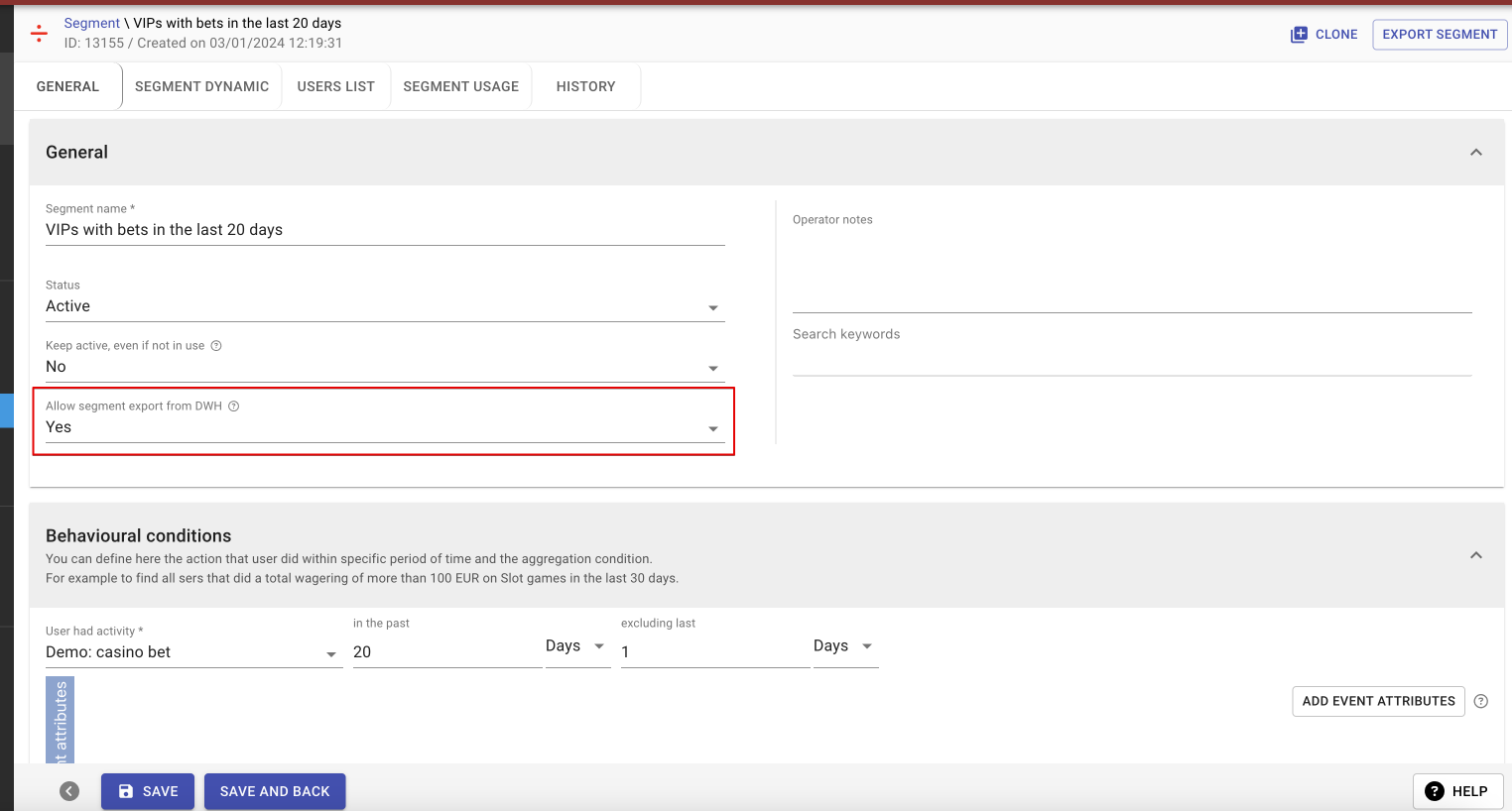 <figure><img src="https://77049817-files.gitbook.io/~/files/v0/b/gitbook-x-prod.appspot.com/o/spaces%2FfS5hl0PiysHtKAKMsQTe%2Fuploads%2Fgit-blob-ea34f81ca102b42d1d83667ea9877afc32b08fd2%2Fsmartico.ai%20%40%20EU2%202024-06-20%2023-19-12.png?alt=media" alt=""><figcaption><p>Enabled segment to be exportable</p></figcaption></figure>