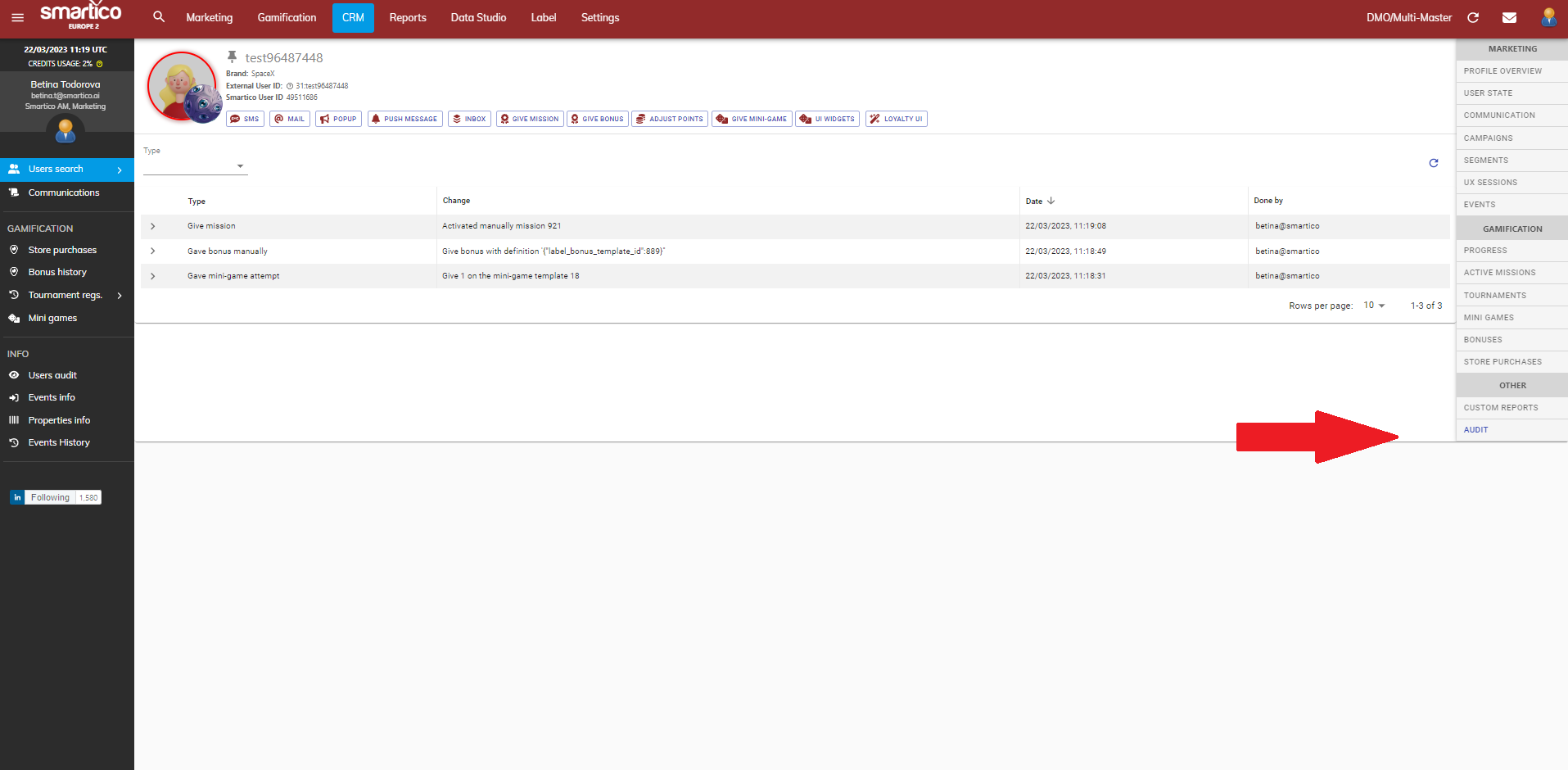 You can check what kind of manual actions have been performed to certain users from each user profile. It keeps a log of manually given missions, bonuses, spin attempts, communications, adjustment of points, marking users, switching off/on gamification, making people test users ets. It shows details about the type of activity, the action done, date and who made the manual action.