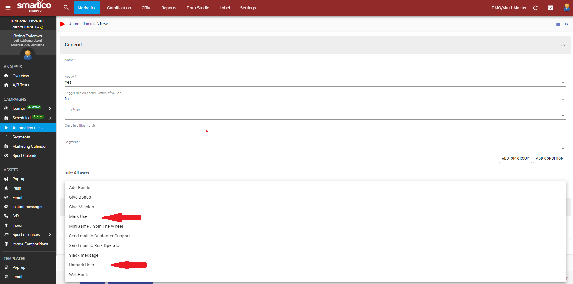 An additional activity giver has been enabled for the automation rules. It's now possible to mark or unmark users as a result of an automation rule activation: