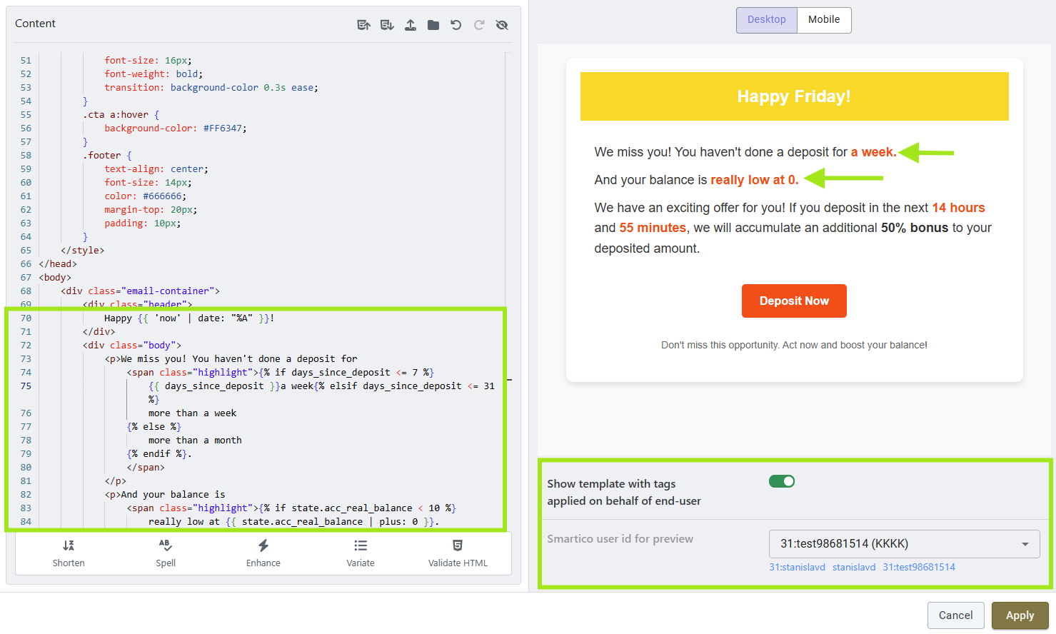 We've added the support of Liquid emails to help you build dynamic, data-driven content, making it perfect for personalized and interactive emails. With Liquid, you can embed variables and conditionals directly into your HTML. This allows you to create highly customized emails that cater to individual recipients, leading to more engaging and effective campaigns.