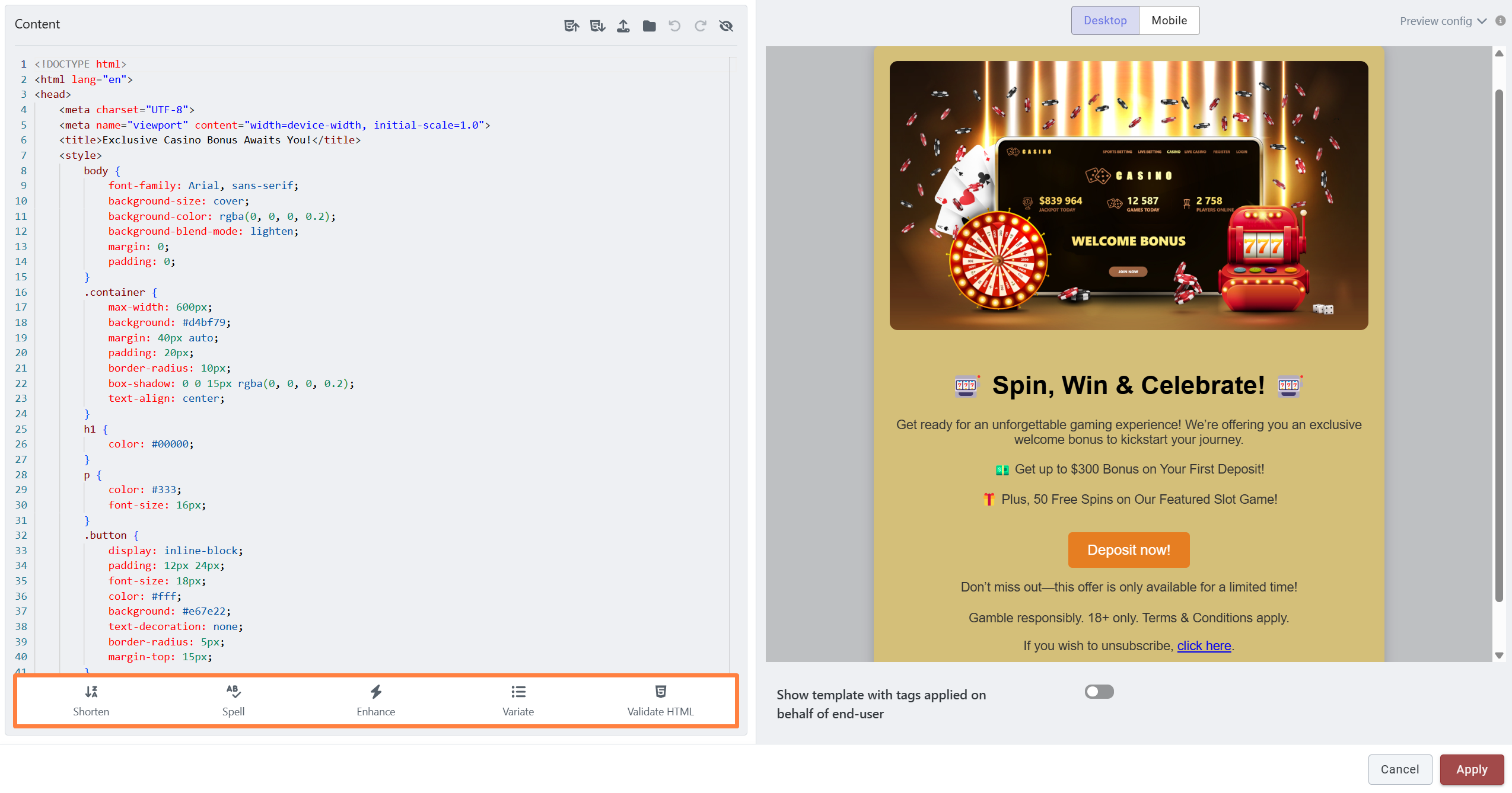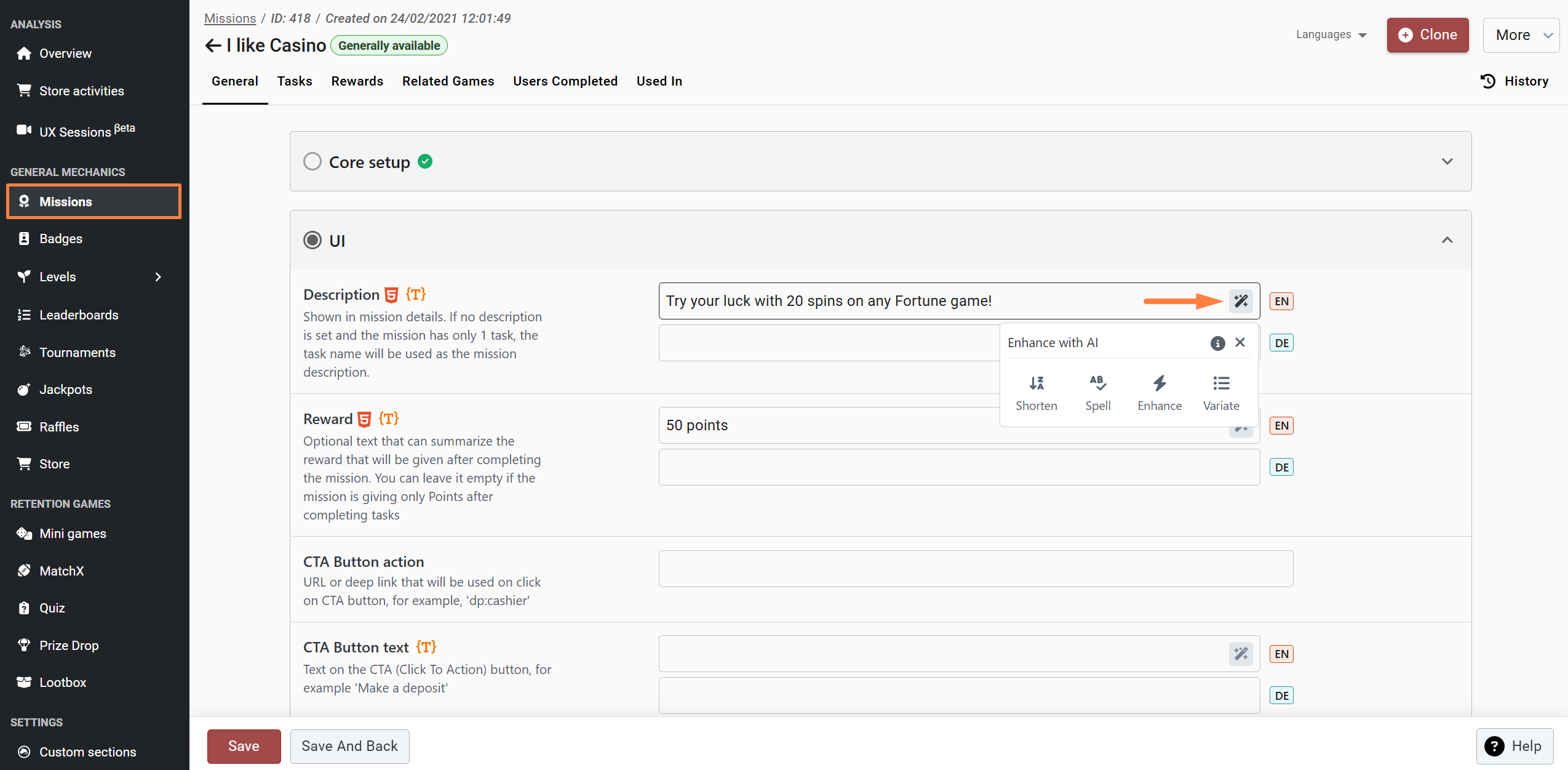 We've added an AI Enhancer tool in the BO to assist with writing descriptions, promo texts, terms & conditions, and more. This tool allows you to shorten text, check for spelling errors, enhance content, and generate variations. Additionally, the AI Enhancer is available in the email editor, where you can also validate HTML and check for errors when creating HTML and Liquid emails.