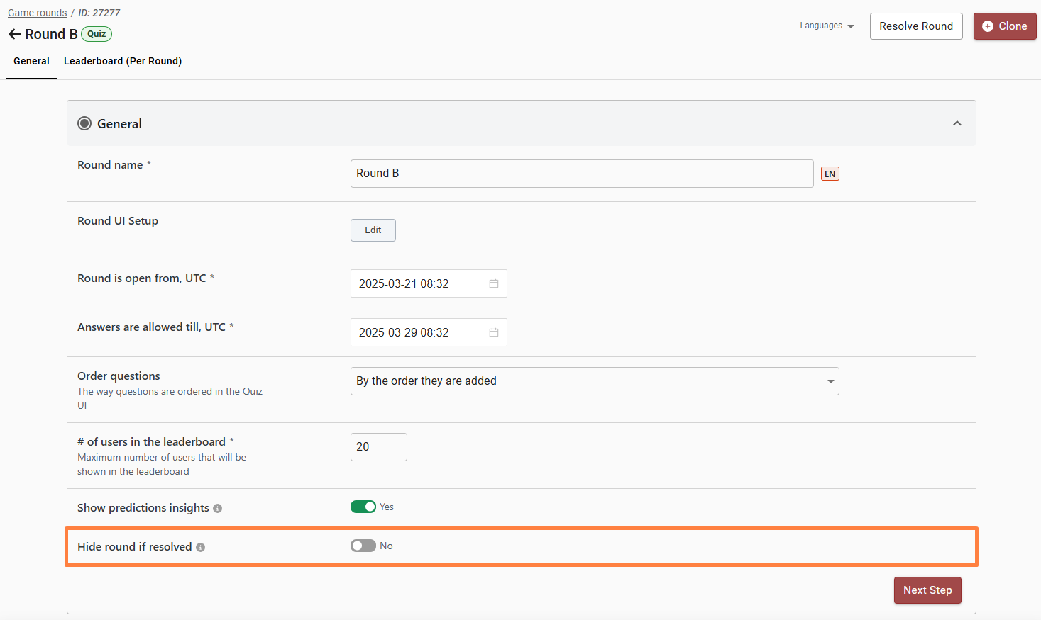 You can now choose to hide a resolved round in the Quiz. A new option, ‘Hide round if resolved’, is available in the BO under Round settings. By default, this option is disabled, meaning the round remains visible even after it is resolved. If enabled, the round will no longer be displayed in the UI once it has been resolved and will not be visible in the Leaderboards as well.