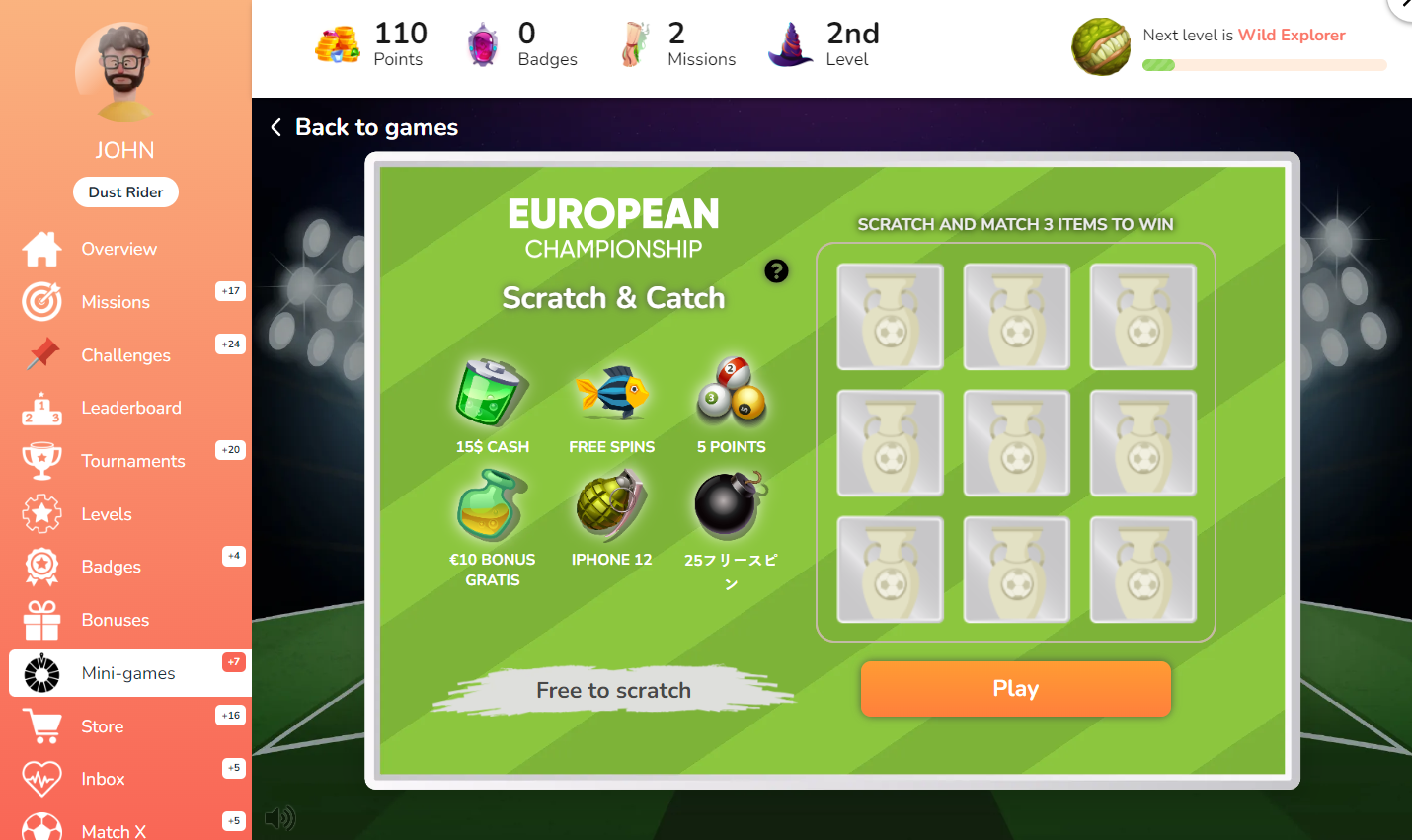 <div><figure><img src="https://77049817-files.gitbook.io/~/files/v0/b/gitbook-x-prod.appspot.com/o/spaces%2FfS5hl0PiysHtKAKMsQTe%2Fuploads%2Fgit-blob-799213889bbb9433a52a5f0dfbe562923452a07c%2FScreenshot_8.png?alt=media" alt=""><figcaption><p>EURO Scratch Card</p></figcaption></figure> <figure><img src="https://77049817-files.gitbook.io/~/files/v0/b/gitbook-x-prod.appspot.com/o/spaces%2FfS5hl0PiysHtKAKMsQTe%2Fuploads%2Fgit-blob-32e82dc55955e82a8bf9bd8389ee9b992cc6a812%2FScreenshot_9.png?alt=media" alt=""><figcaption><p>EURO Spin the Wheel</p></figcaption></figure> <figure><img src="https://77049817-files.gitbook.io/~/files/v0/b/gitbook-x-prod.appspot.com/o/spaces%2FfS5hl0PiysHtKAKMsQTe%2Fuploads%2Fgit-blob-9bbf62c09eea722386b1e6c8037253d9eafdcc78%2FScreenshot_10.png?alt=media" alt=""><figcaption><p>EURO Giftbox</p></figcaption></figure></div>