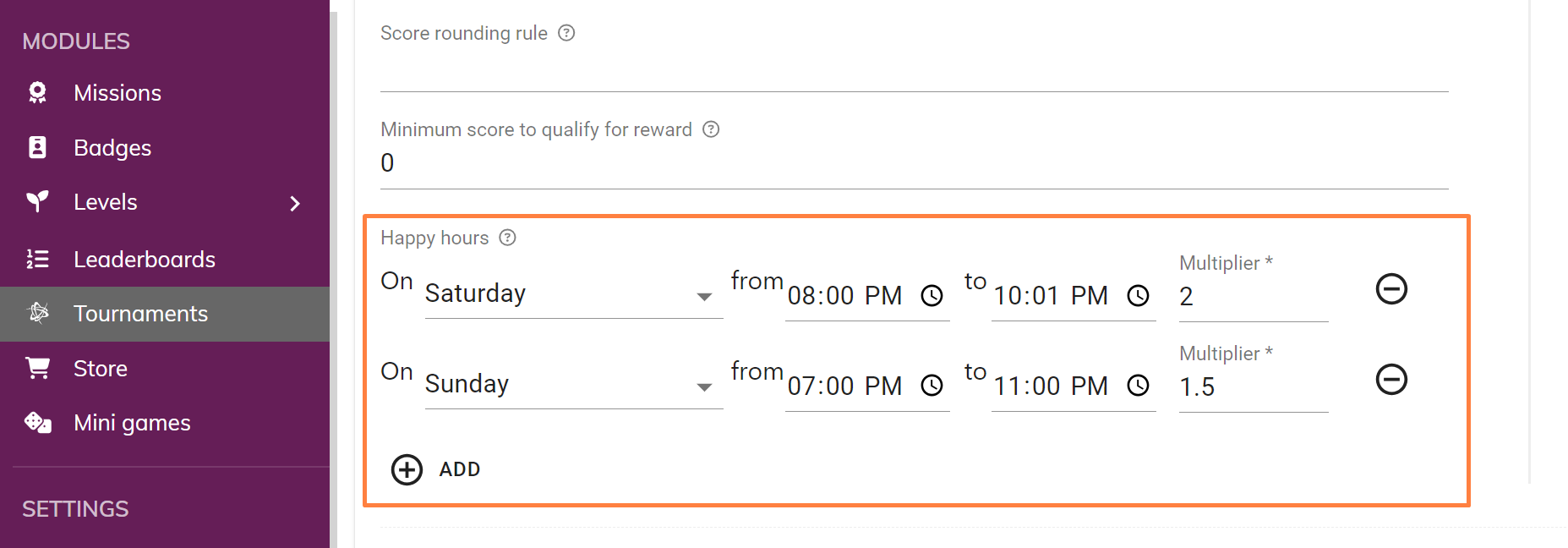The option is available in the BO within the Tournament template, and it is disabled by default. When it’s enabled, you can choose the period when players will receive more points and the multiplier by which the points will be multiplied. Once the period that is set for the ‘Happy hour’ is over the players will again receive the regular amount of points (not multiplied).