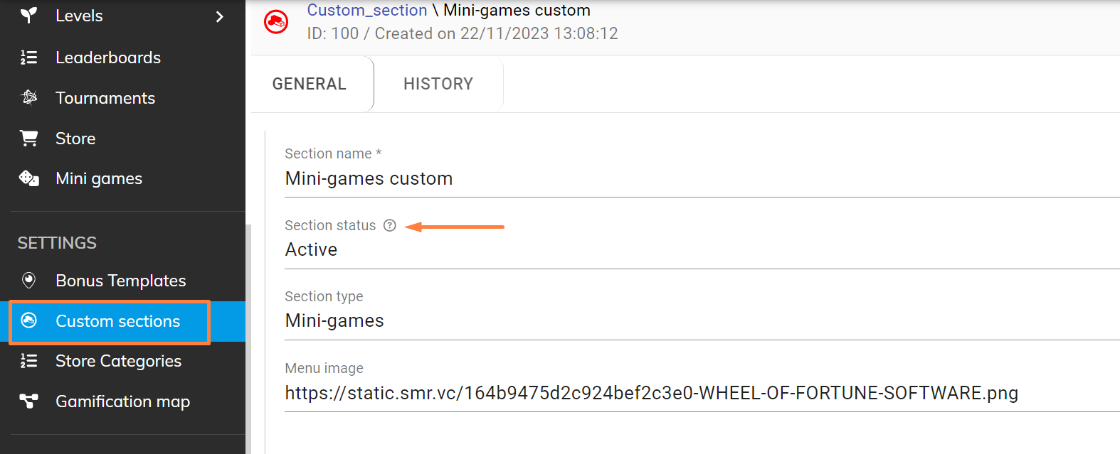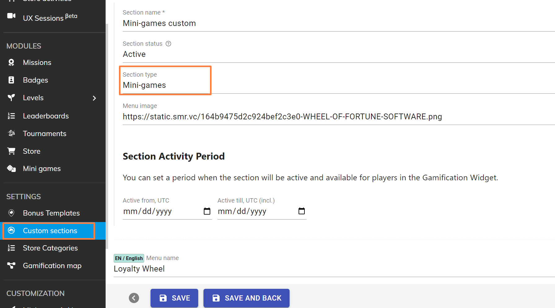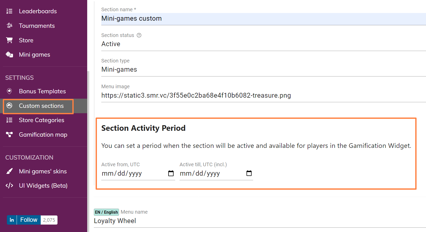 We have added an activity period for the Custom Sections. Now operators can schedule when a specific custom page will become visible for the players in the Gamification Widget. The setting is available in the BO within the Custom Section template, and it has two options:
