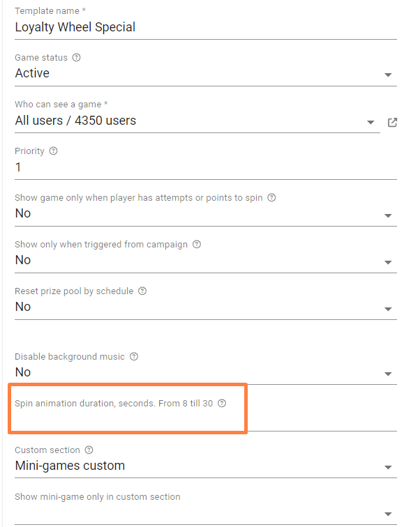 Now operators can adjust the spinning speed on the ‘Loyalty Wheel’ mini-game. The option is available within the mini-game template in the BO and values are measured in seconds. The possible seconds are from 8 to 30 seconds. The default value is set to 15 seconds.