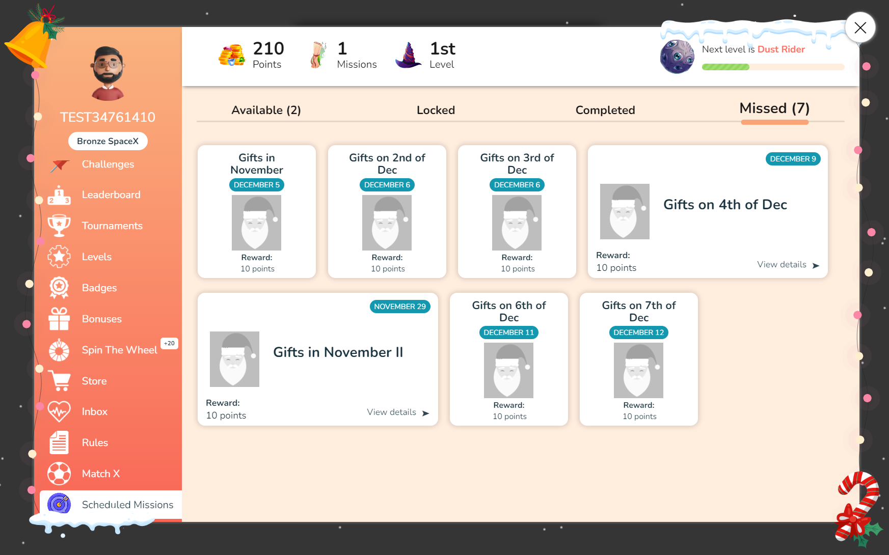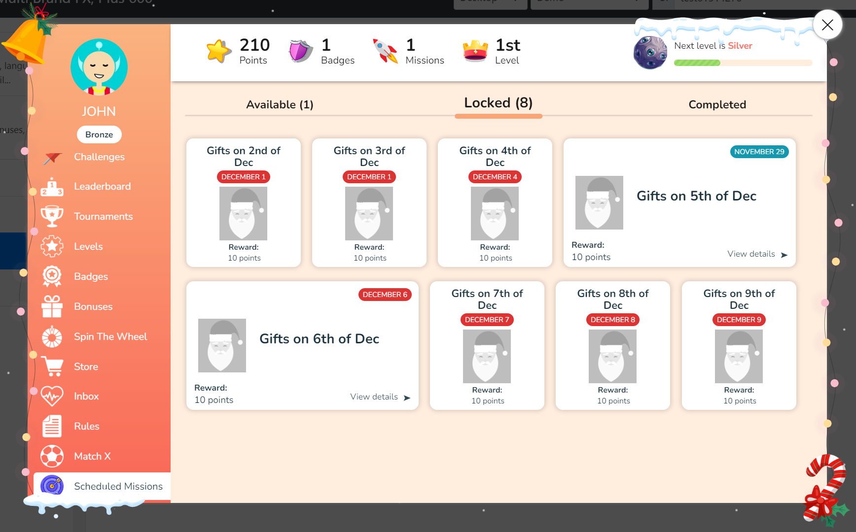 Using this option, you can configure an advent calendar by creating a new Custom Section titled 'Advent calendar,' assigning a few missions, and scheduling them to unlock one mission per day.
