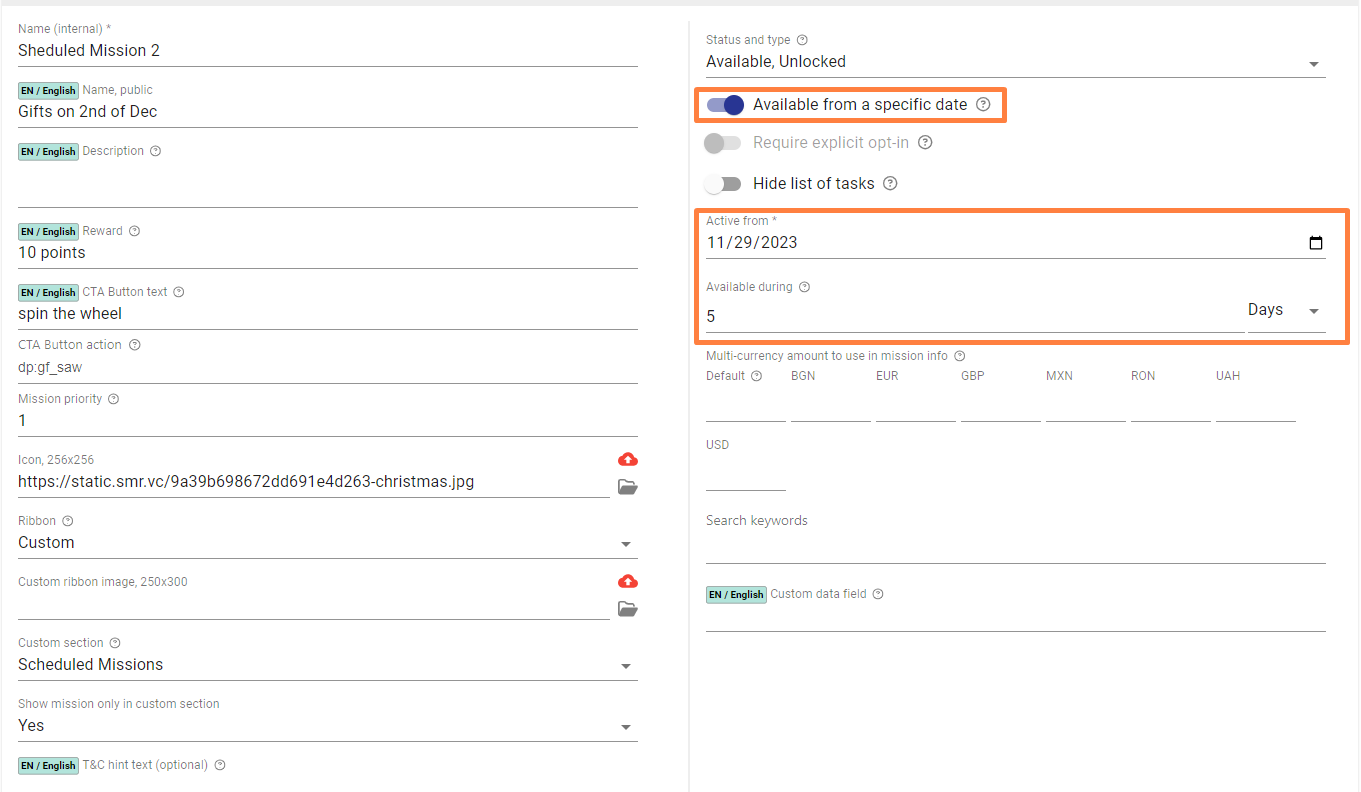 You can now schedule missions to unlock at a specific time. We have added the ‘Available from a specific date’ option in the BO within the mission template, and it is available only for ‘**Available, unlocked**’ missions. It is disabled by default, but when it’s enabled, two more options appear: