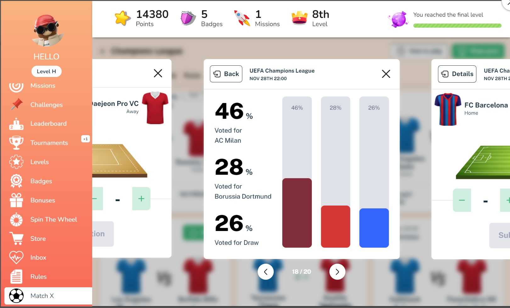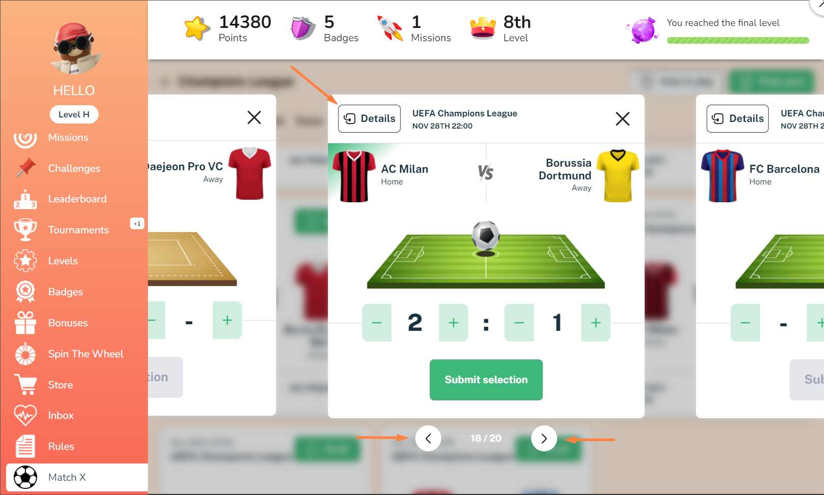 * **New match cards** - Players can now submit selections, edit choices, view finished matches, and navigate to other matches using the new ‘Next’ and ‘Previous’ buttons. Each card has a ‘Play’ button - when the players haven’t predicted anything yet, ’Edit’ - when the players want to edit their predictions’, or ‘View’ - when players are not allowed to submit predictions anymore