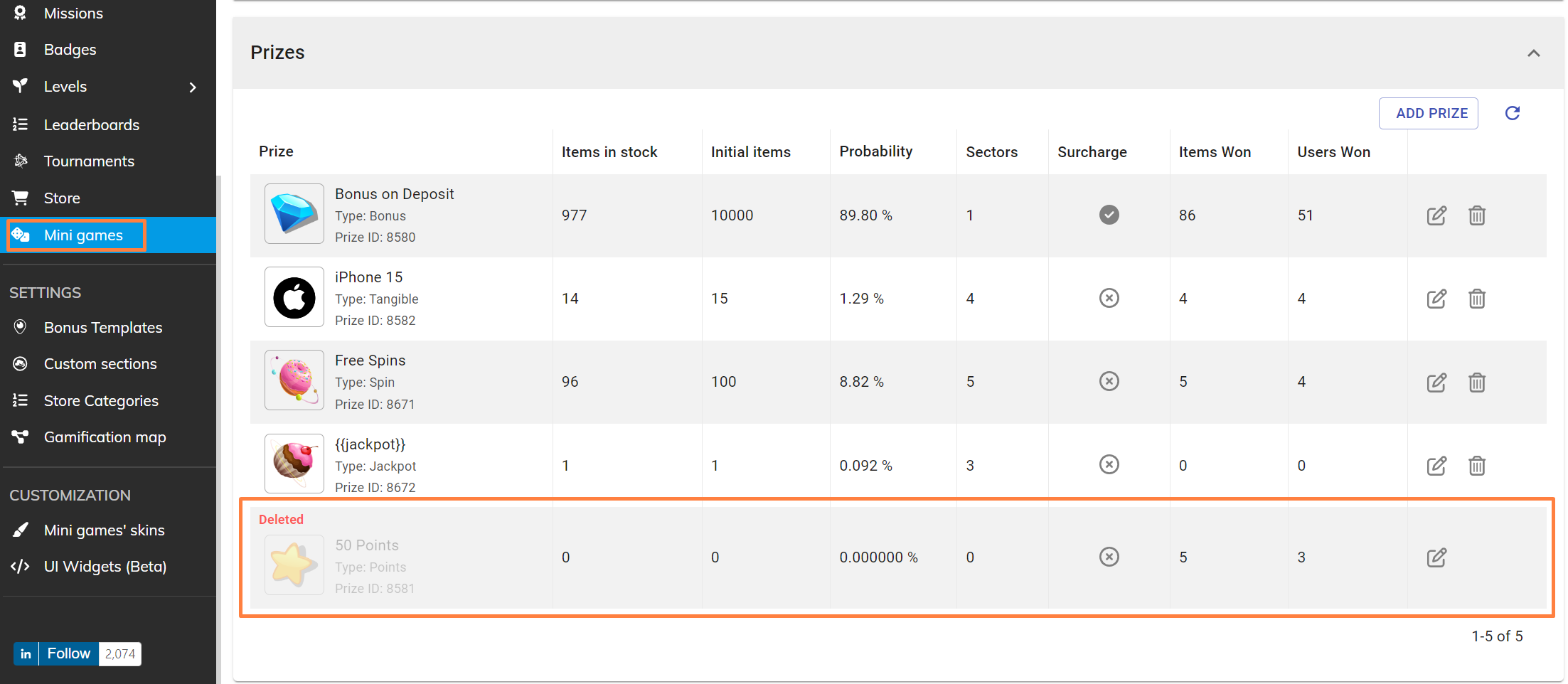 Operators can now delete prizes that players have already won. When deleting a prize that has already been won from the prize list, it will become greyed out with a ‘Deleted’ label and will be moved to the bottom of the list. The items in stock count, initial items count, and sectors will be reset to 0. The deleted prize can be edited and changed back to active state.