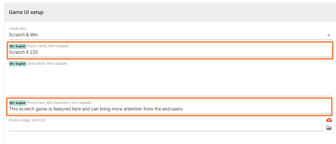 The title and the description of the games are configured in the BO within the game template. In the ‘Public name’ field you can define the game's title and in the ‘Promo Text’ field - short description. These settings are applicable for all mini-games and Match X games as well.