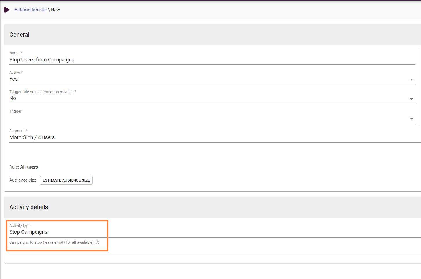 <figure><img src="https://77049817-files.gitbook.io/~/files/v0/b/gitbook-x-prod.appspot.com/o/spaces%2FfS5hl0PiysHtKAKMsQTe%2Fuploads%2Fgit-blob-d5b47eec7d7f78f256c4920ad40ff50981a4d966%2FStopAuto.png?alt=media" alt=""><figcaption><p>Configuration of Automation rule that will stop all campaigns</p></figcaption></figure>
