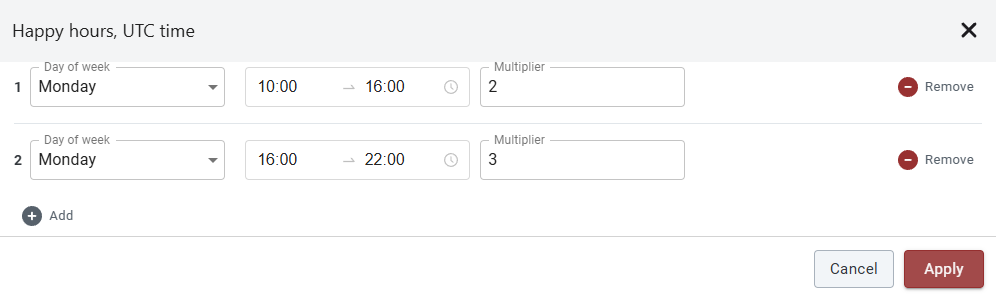 For example, you can now configure a Happy Hour on Monday from 10:00–16:00 (x2 multiplier) and another from 16:00–22:00 (x3 multiplier).