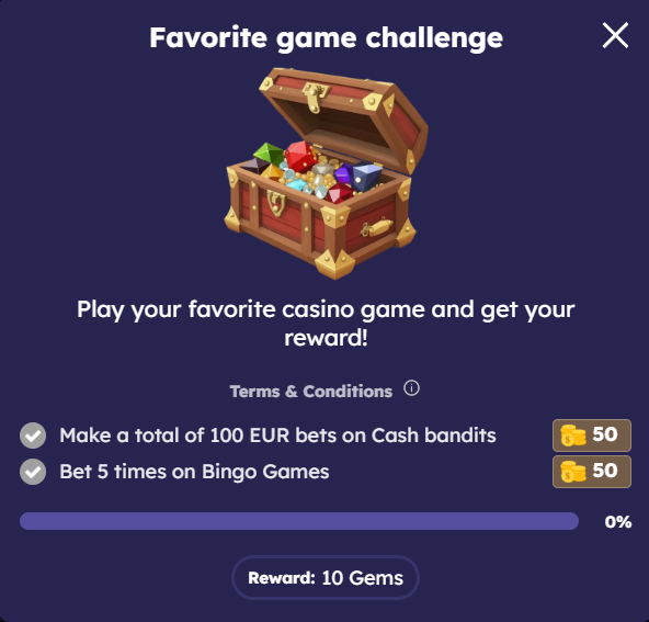You can now create a **Dynamic** **mission** where players progress by playing their favorite casino game, casino game provider or favorite game type. The main difference between this and a regular mission lies in how the task is configured. The favorite game mission supports all types of missions - **Generally available, Locked, Recurring, Recurring upon completion, Featured manually.**