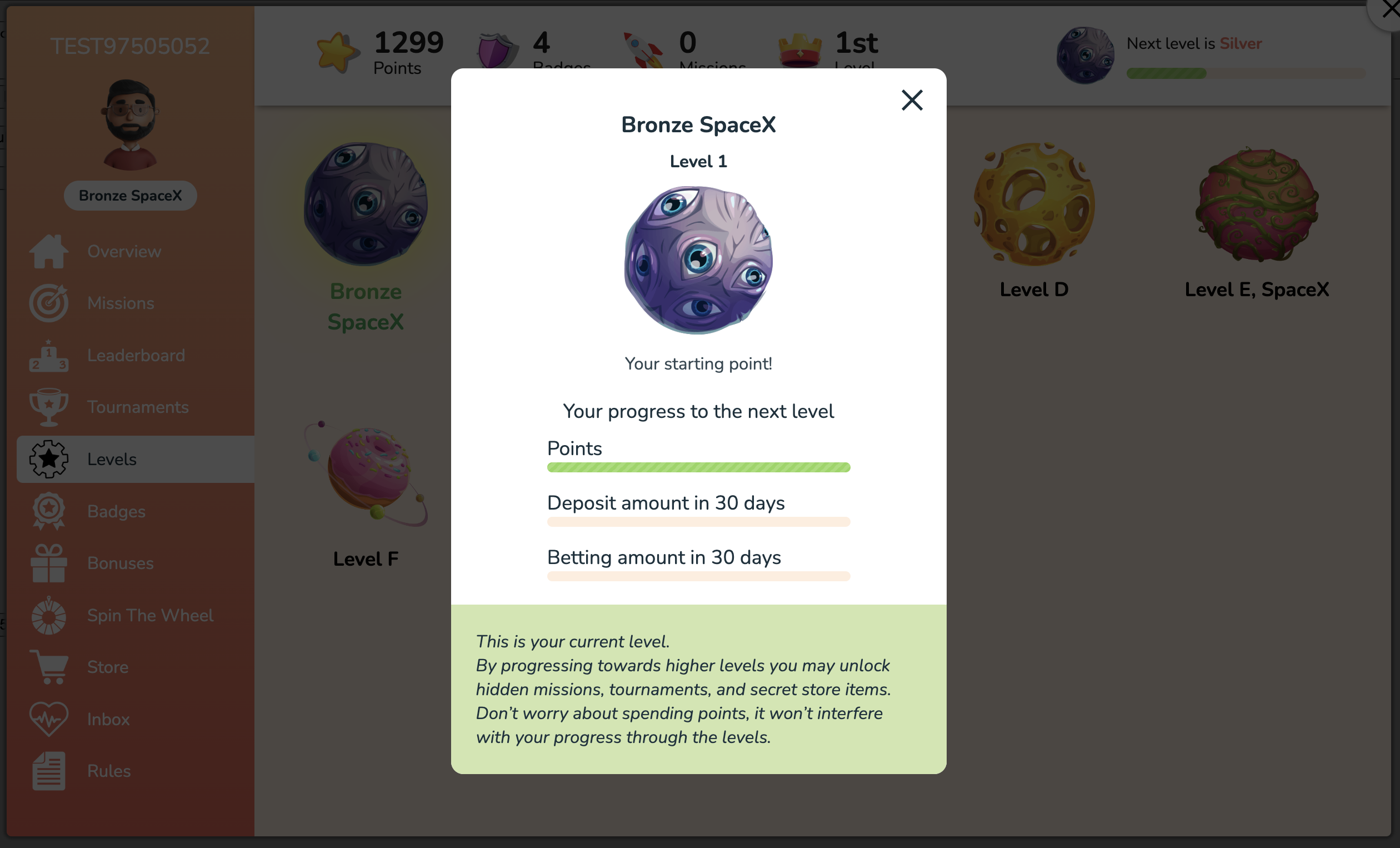<figure><img src="https://77049817-files.gitbook.io/~/files/v0/b/gitbook-x-prod.appspot.com/o/spaces%2FfS5hl0PiysHtKAKMsQTe%2Fuploads%2Fgit-blob-318c45d0fca0c4be96fc4bab6f2bcf6230278150%2Fimage.png?alt=media" alt=""><figcaption><p>Levels are built on 3 criteria - the user needs to collect gamification points and reach a specific amount of Deposits and wagering in Casino bets</p></figcaption></figure>