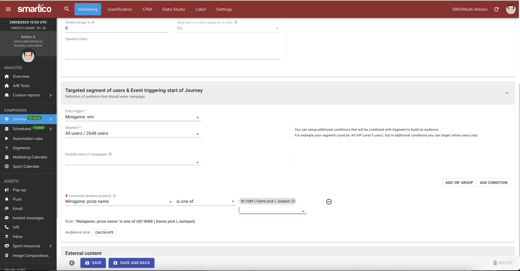 <figure><img src="https://77049817-files.gitbook.io/~/files/v0/b/gitbook-x-prod.appspot.com/o/spaces%2FfS5hl0PiysHtKAKMsQTe%2Fuploads%2Fgit-blob-6b71c318a2a00b7a68a2b8db2307a907e75bd11d%2Fsmartico.ai%202022-09-29%2015-02-39.png?alt=media" alt=""><figcaption><p>Operational campaign to inform Support in case Jackpot was won</p></figcaption></figure>
