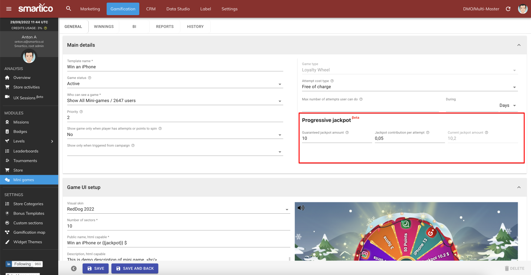 <figure><img src="https://77049817-files.gitbook.io/~/files/v0/b/gitbook-x-prod.appspot.com/o/spaces%2FfS5hl0PiysHtKAKMsQTe%2Fuploads%2Fgit-blob-bbaeb8e17c09a05d3319d9da25ef28fa80251d42%2Fsmartico.ai%202022-09-29%2014-44-45.png?alt=media" alt=""><figcaption><p>Configuration of jackpt in the mini-game</p></figcaption></figure>
