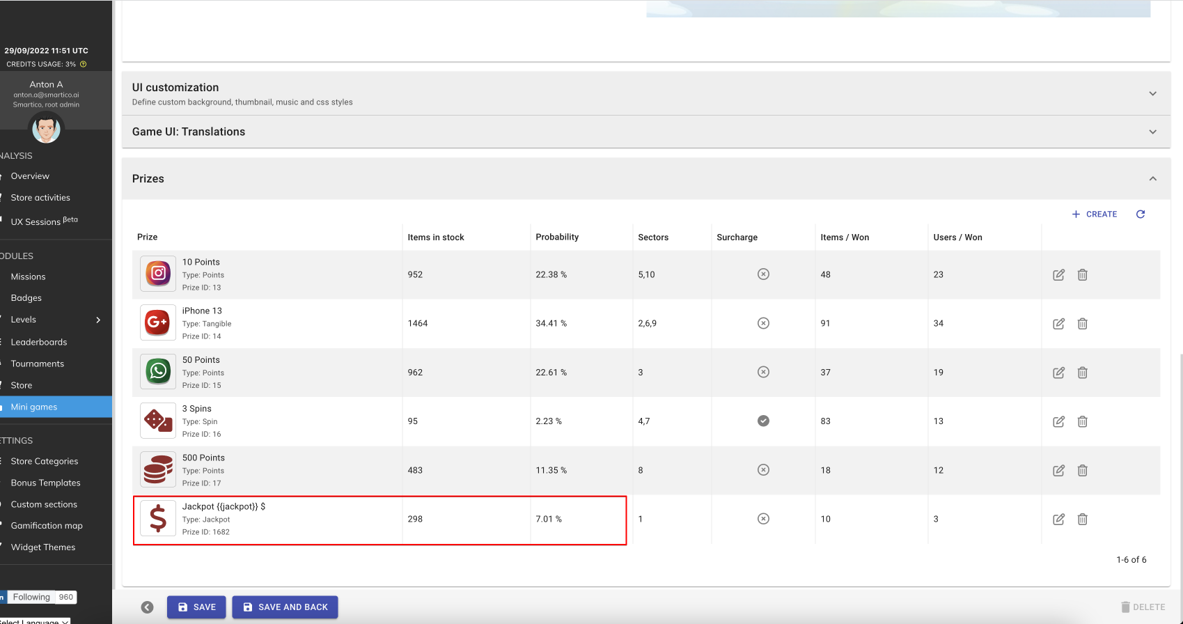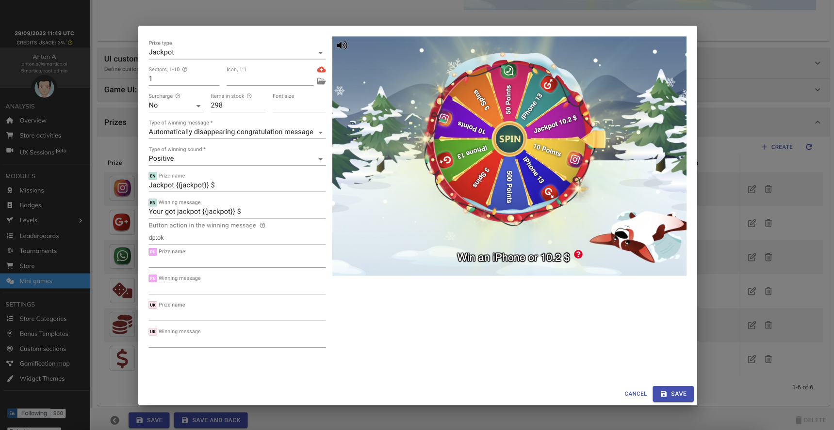 <figure><img src="https://77049817-files.gitbook.io/~/files/v0/b/gitbook-x-prod.appspot.com/o/spaces%2FfS5hl0PiysHtKAKMsQTe%2Fuploads%2Fgit-blob-d2987d2926bd4b4162697ddae3e5d996a58f74ab%2Fsmartico.ai%202022-09-29%2014-49-43.png?alt=media" alt=""><figcaption><p>Setting jackpot prize definition, probability and position in sectors</p></figcaption></figure>