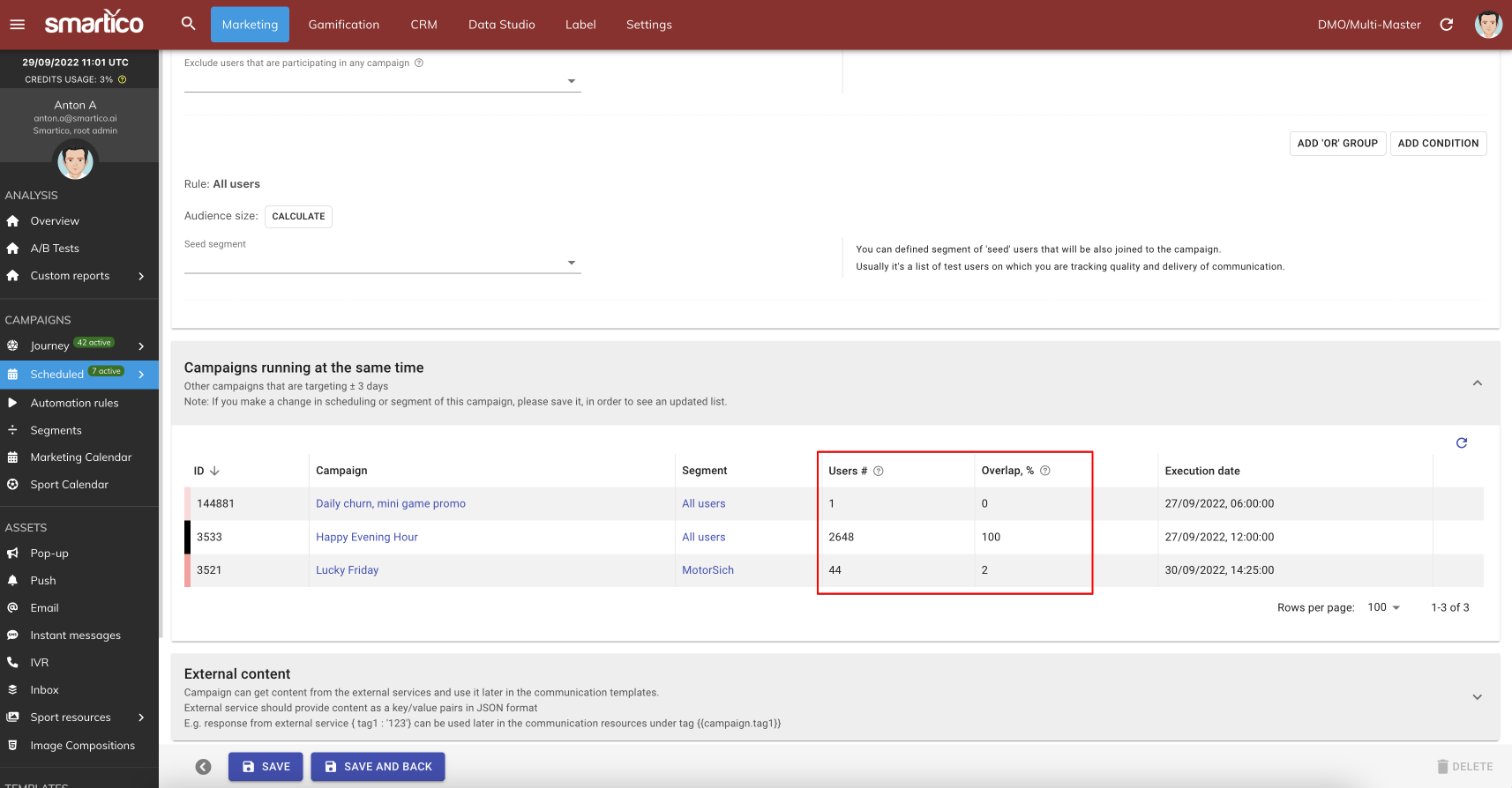 Once you create a scheduled campaign, the feature automatically finds for you other scheduled campaigns which are planned for the ± 3 days from your original campaign and shows you the overlap size in the % of the original campaign.