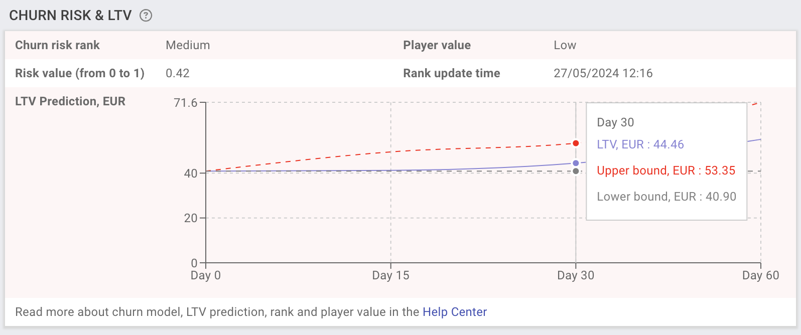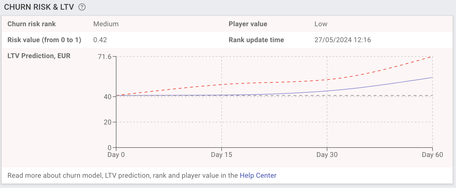 <figure><img src="https://77049817-files.gitbook.io/~/files/v0/b/gitbook-x-prod.appspot.com/o/spaces%2FfS5hl0PiysHtKAKMsQTe%2Fuploads%2Fgit-blob-18682da3adc76cffa605a806782bbe773ccb317b%2Fimage.png?alt=media" alt=""><figcaption><p>Churn risk and LTV projection card on the player profile</p></figcaption></figure>