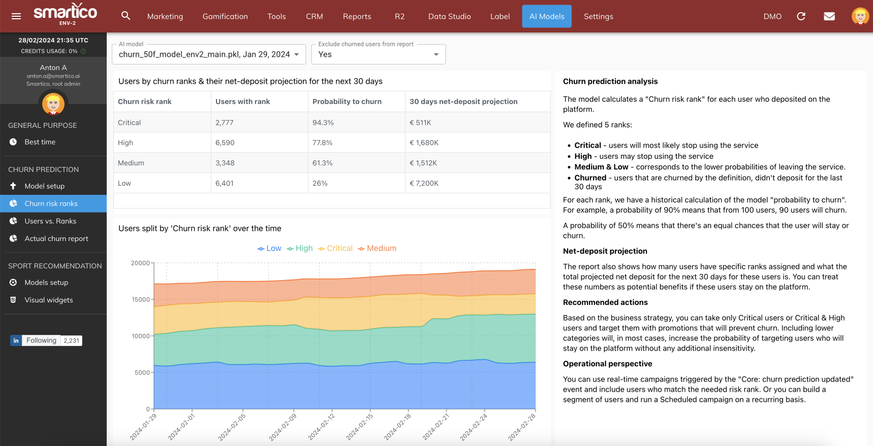 This tool is particularly focused on predicting the likelihood of players not depositing within the next 7, 14 or 30 days. The model assigns each player a churn probability score daily. This scoring system is integral to categorizing players into risk groups, thereby providing the possibility to enhance player retention.