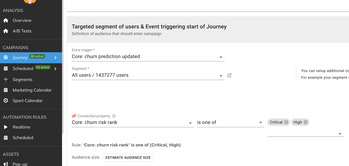 <figure><img src="https://77049817-files.gitbook.io/~/files/v0/b/gitbook-x-prod.appspot.com/o/spaces%2FfS5hl0PiysHtKAKMsQTe%2Fuploads%2Fgit-blob-7093300c808ac0da88c6166e7e6a3a08697ea9a8%2Fsmartico.ai%20%40%20EU2%202024-02-28%2023-46-25.png?alt=media" alt=""><figcaption><p>Campaign that triggered by entering into Critical or High ranks</p></figcaption></figure>