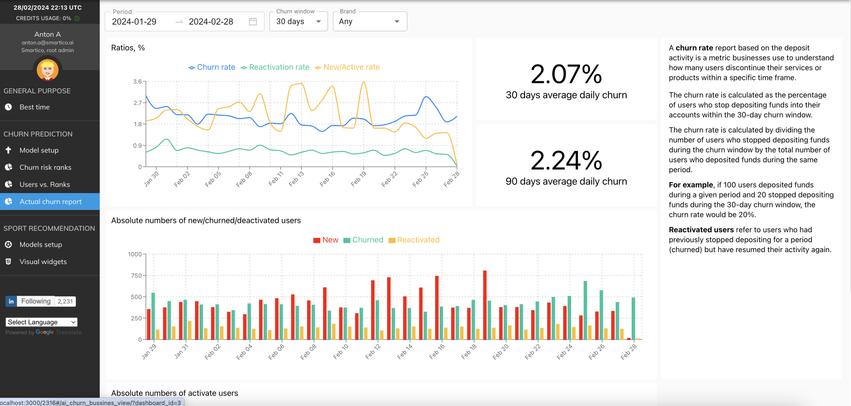 In the context of this model, a player is considered to have churned if he has not deposited within the defined by the operator number of days - 7, 14 or 30. Based on the custom needs of the clients, Smartico can train models for different no-deposit periods or different definitions (e.g., no deposits and no gameplay)