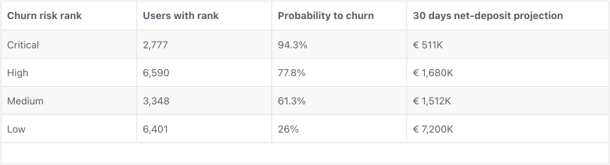 <table><thead><tr><th width="167">Rank name</th><th>Explanation</th></tr></thead><tbody><tr><td>Not set</td><td>Player didn't have any deposit yet</td></tr><tr><td>Low</td><td>Low probability of chrun, no action required. Risk value 0-0.4</td></tr><tr><td>Medium</td><td>Medium probabilty of churn, no action required. Risk value 0.4-0.6</td></tr><tr><td>High</td><td>There is a high probability of churn; action is recommended. Risk value 0.6-0.85</td></tr><tr><td>Critical</td><td>Risk 0.85-1, action is highly recommended.</td></tr><tr><td>Churned</td><td>Player is churned by definition. Didn't deposit for X days</td></tr><tr><td>Invalidated</td><td>The churn rank is invalidated because of the user activity. See the "Churn rank invalidation" case below.</td></tr></tbody></table>