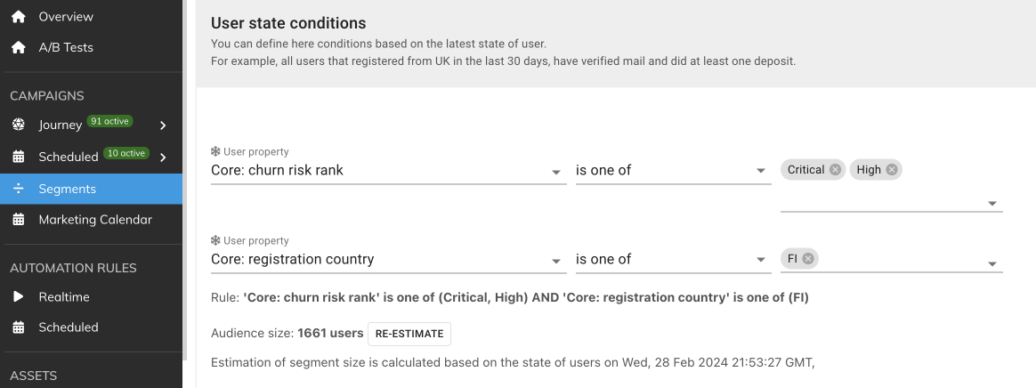 Churn risk can also create a segment of users that can later be used in the Campaign, Automation rules, Missions, Mini-games, and Tournaments.