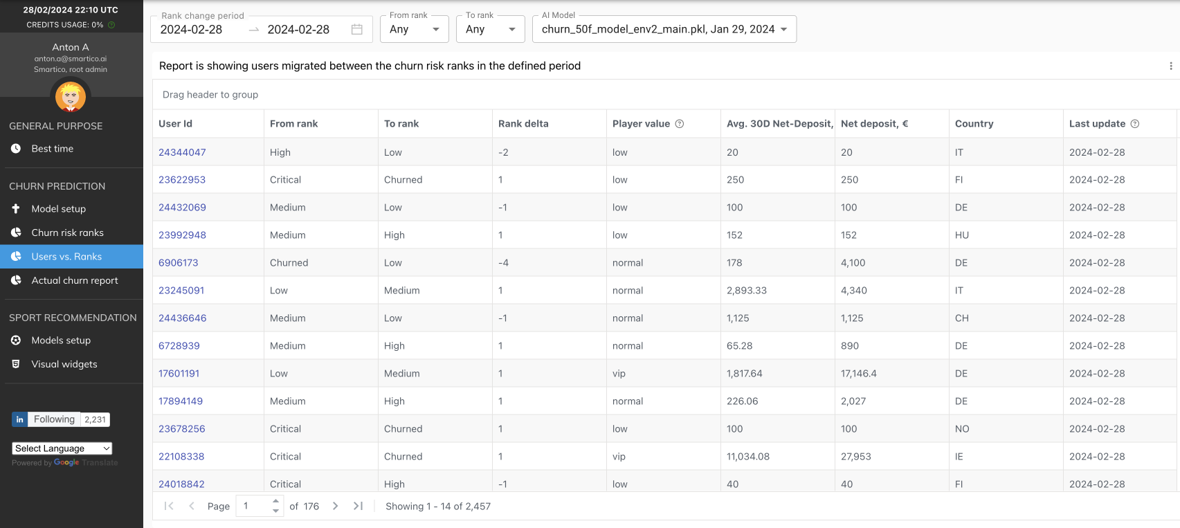 This report shows the number of players for each rank and the "Probability to churn" for this rank, calculated based on historical predictions.