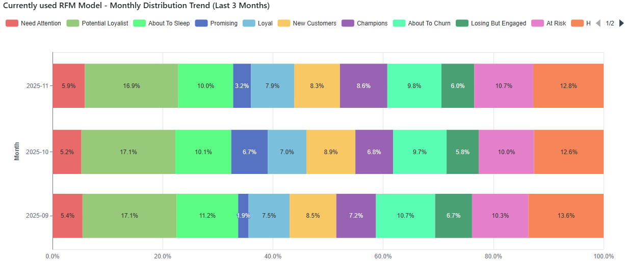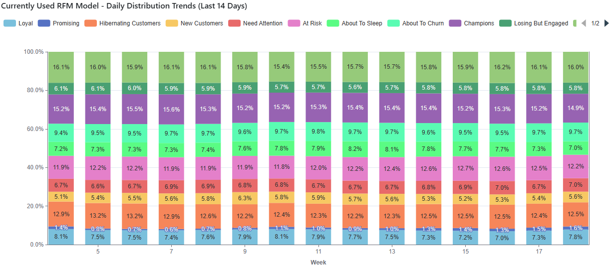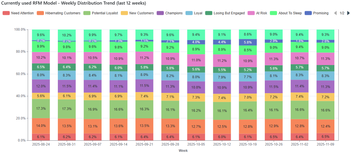 Best used to monitor mid-term changes in the Business. For example, the week-over-week increase in "Champions" segment share might indicate marketing optimization.