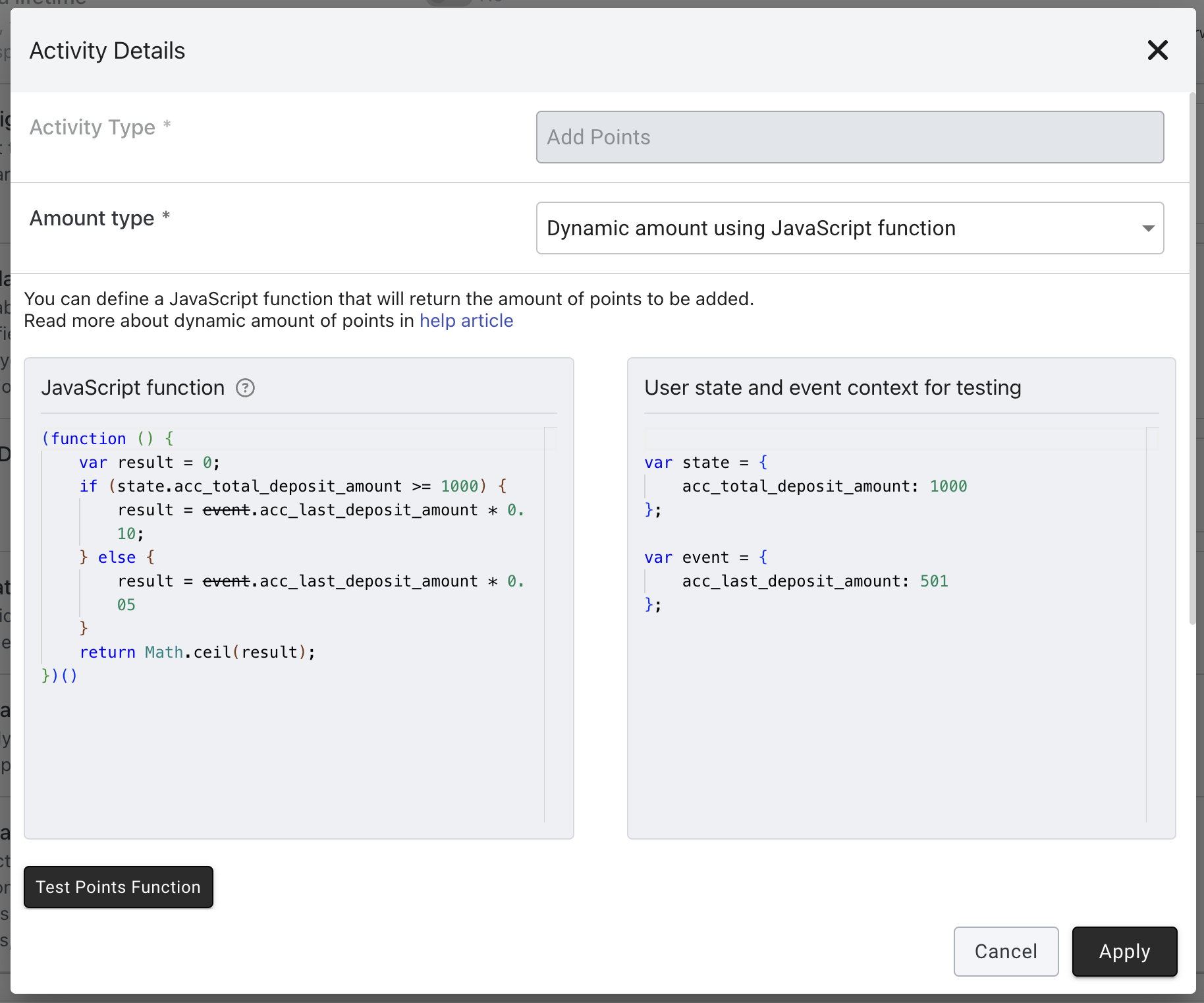 Button "Test points function" will give you immidiate result, so you can verify your definition before enabling activity for end users.
