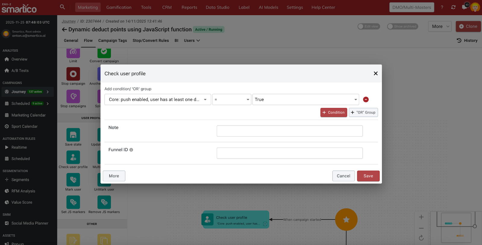 For example, the operator wants to send a Push notification message, and before that, to check if the user has devices with push notification permissions allowed ("Core: push enabled, user has at least one device").